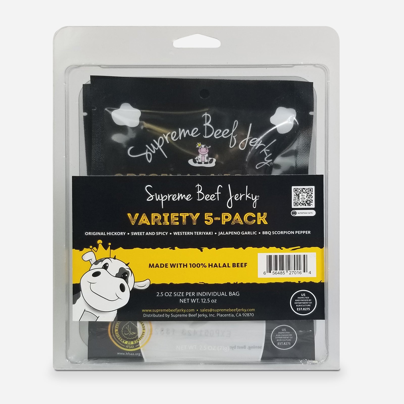 Supreme Beef Jerky offers a 5-Pack of gourmet Halal beef jerky made with bold flavor. 2.5 ounces of premium jerky come packaged in each resealable bag for easy storage. The jerky is made with humanely raised, source-verified Zabiha Halal beef. The beef is sourced from cattle farms with management practices that maintain the highest quality in Halal standards. Prime cuts of 100% USDA meat are selected and marinated to perfection. All-natural ingredients are used to offer the perfect taste in every bite.