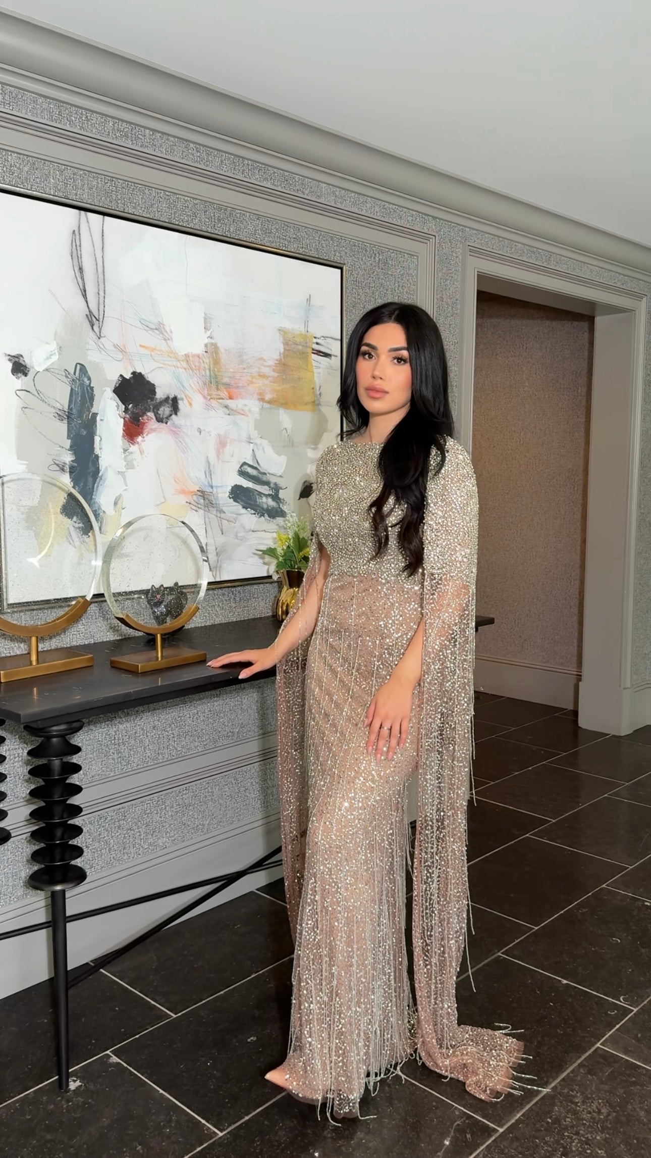This timeless evening gown offers a luxurious feel with its shimmering beading and sequin details. An elegant and sophisticated ensemble, this ankle-length dress features a fully lined design for modesty, and a bejeweled adornment with tasseled details cascading down the garment. The tassel embellishment adds a chic finishing touch, making the Aleya Drape Cape Sleeve Beaded Dress a truly exclusive statement. Dress is fully beaded which makes it heavy.