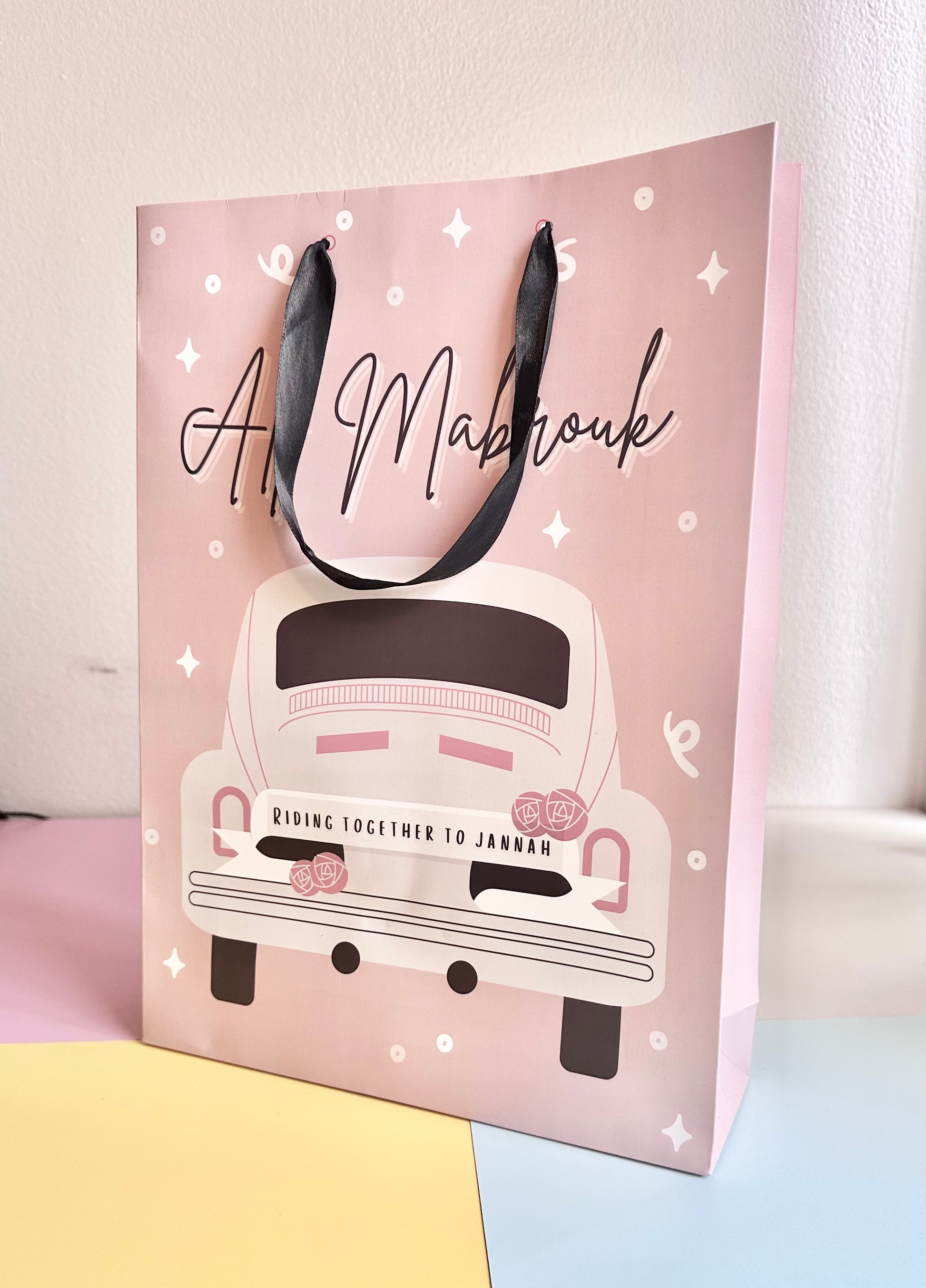 Hard paper, soft touch finish gift bag with satin ribbon handles