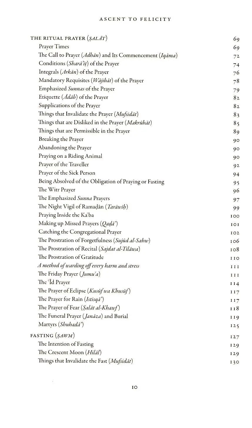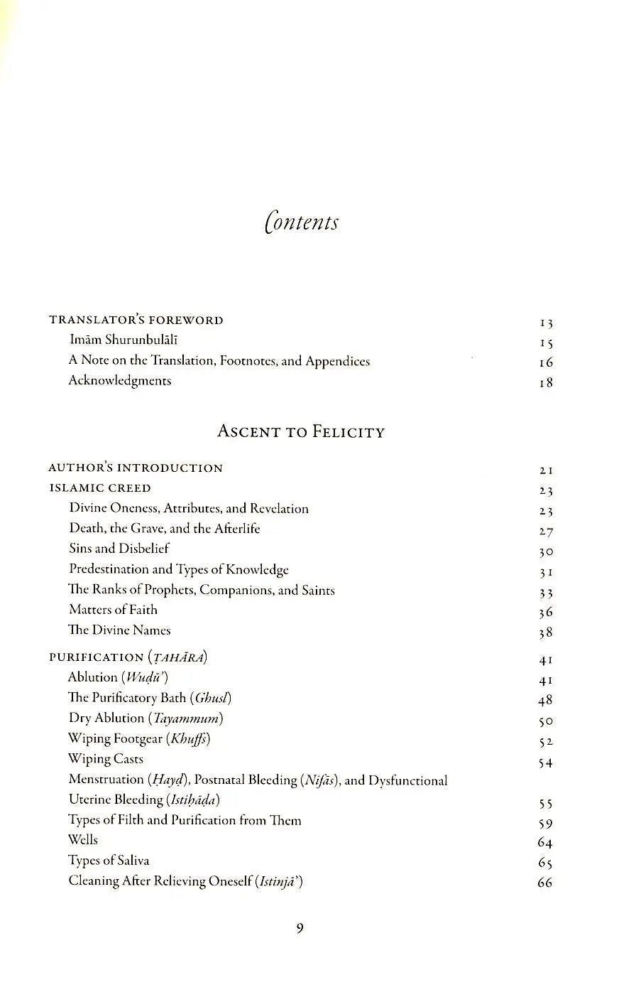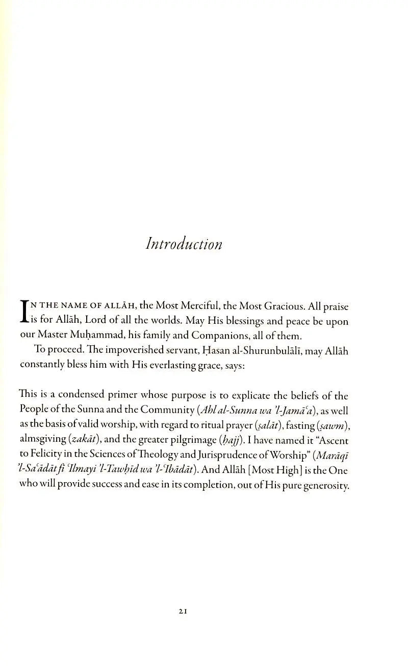 Written by the eminent 11th century Hanafi scholar, Abu ’l-Ikhlas al-Shurunbulali, Ascent to Felicity is a concise yet comprehensive primer in creed and jurisprudence. It spans all five pillars of Islam, as well as the topics of slaughtering, ritual sacrifice, and hunting. To supplement the text, the translator has added key explanatory notes taken from several reliable works on theology and jurisprudence. He has also added appendices that comprise numerous supplications related to the five pillars, presented in Arabic script along with English transliteration, as well as the etiquette of visiting the Messenger of Allāh (Allah bless him peace) in Madina.