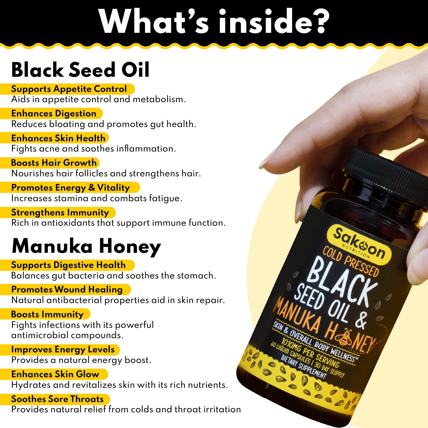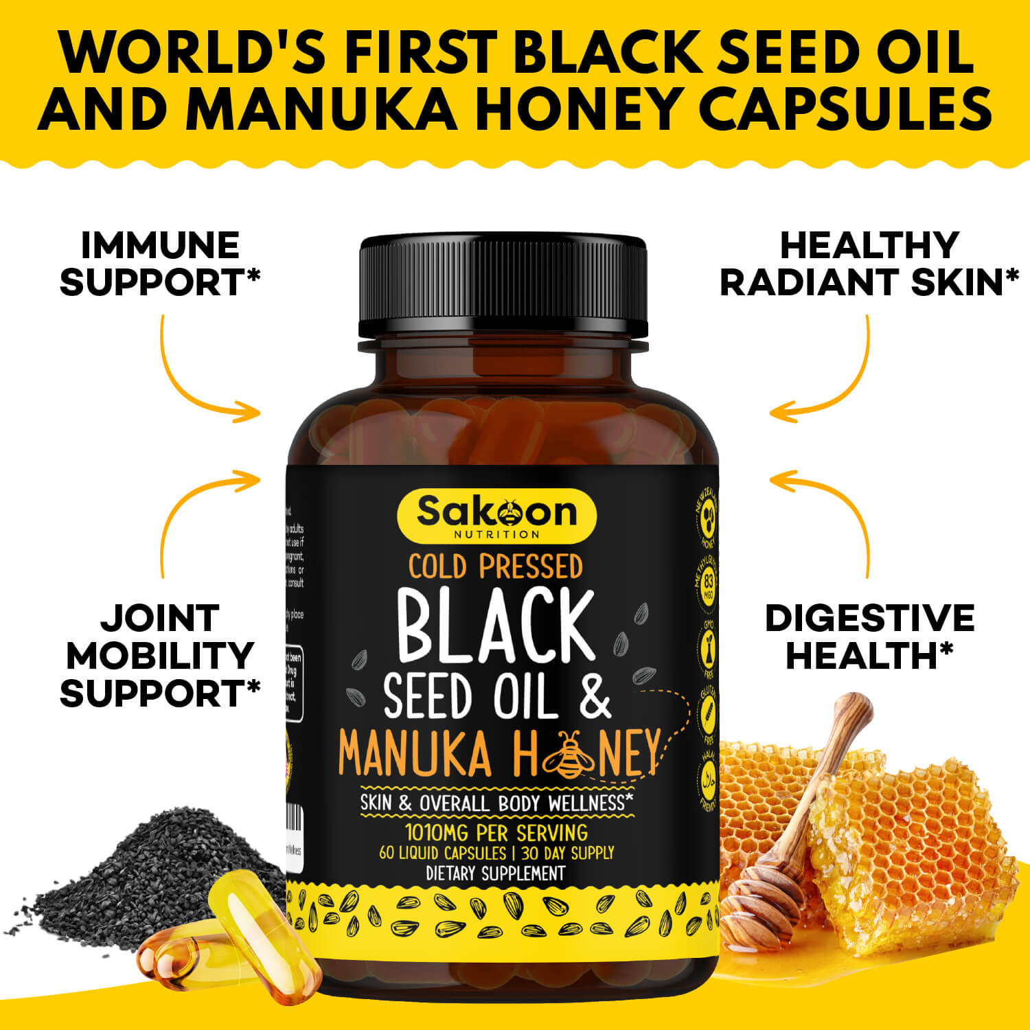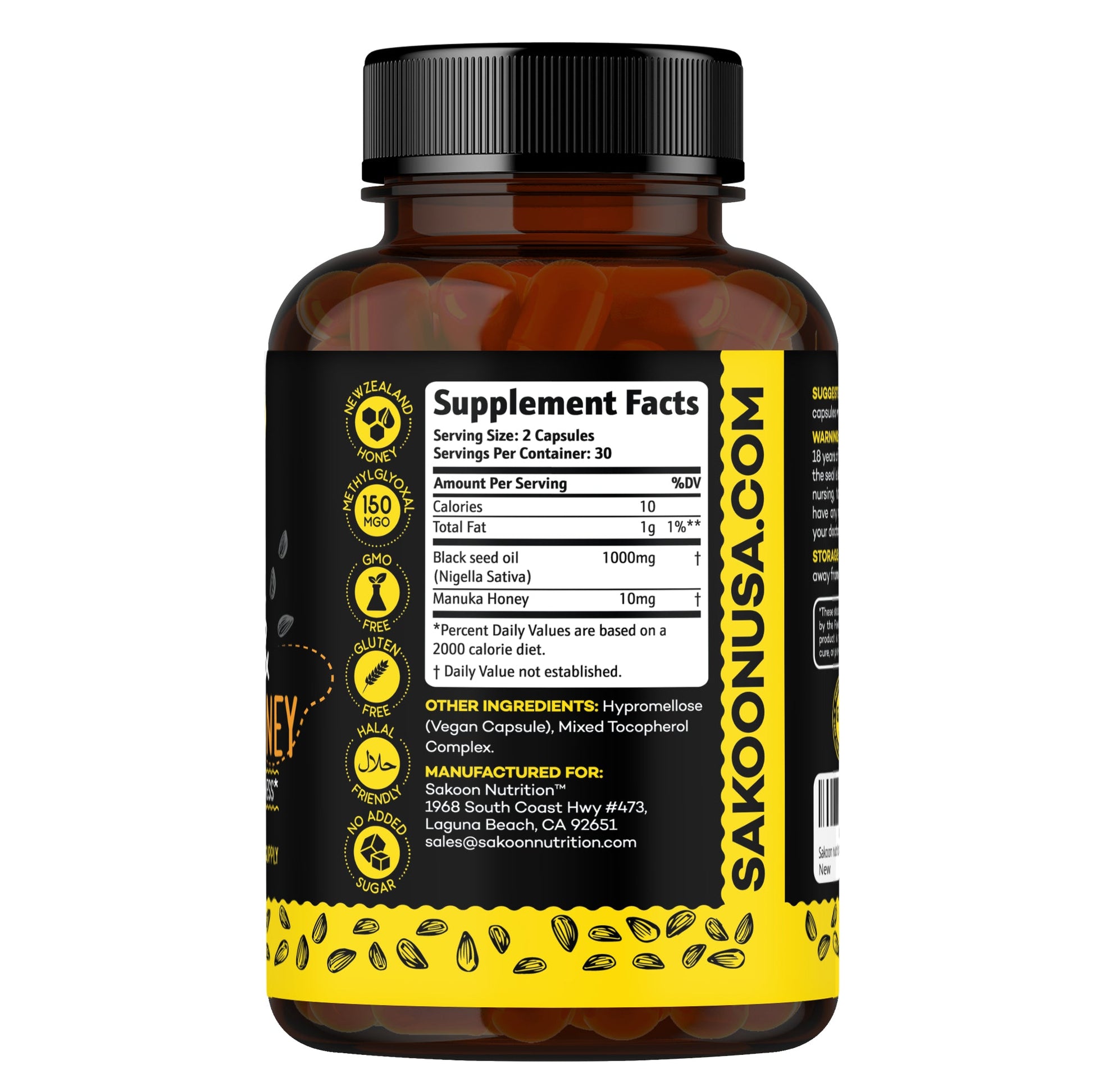 Antioxidant-Rich Blend: Experience the alliance of black seed oil and manuka honey, two ingredients known for their antioxidant properties. Black seed oil's thymoquinone and manuka honey's methylglyoxal come together to support overall vitality.