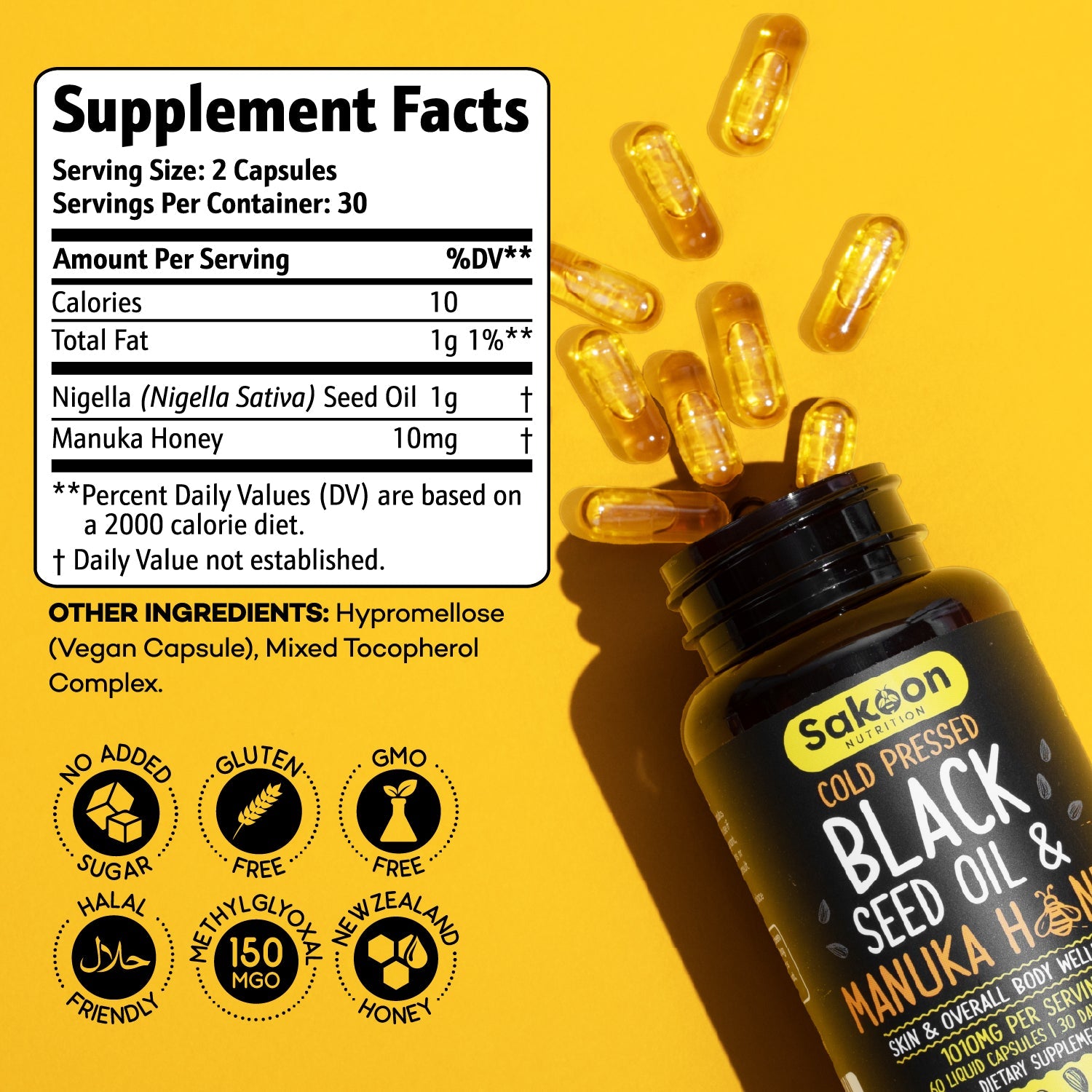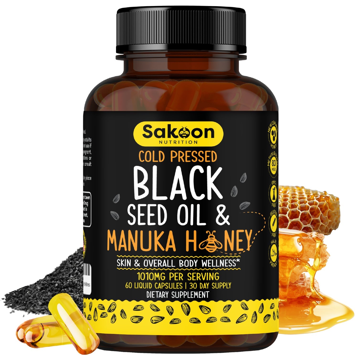 Introducing our premium product: Unlock Nature's Power, a dynamic fusion of Nigella Sativa and New Zealand Manuka Honey encapsulated in every serving. Each capsule contains 1000mg of Pure Cold-Pressed Black Seed Oil alongside 100mg of MGO 156+ Manuka Honey, delivering a potent blend of natural ingredients.