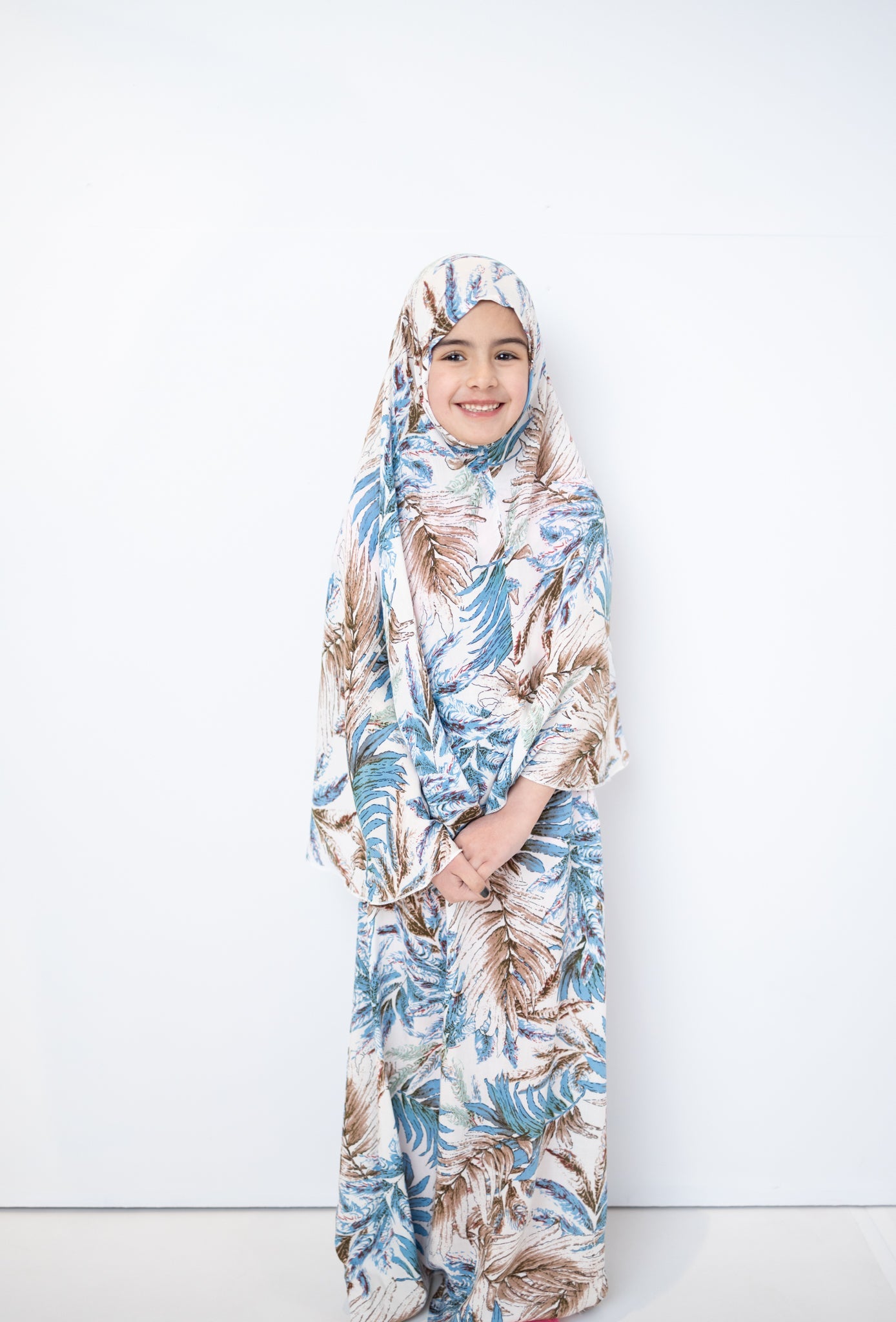 This Child Two-Piece Prayer Outfit in Blue Tropics is perfect for daily prayers. Its lightweight, breathable fabric is designed for comfort, perfect for kids to look stylish and stay comfortable.