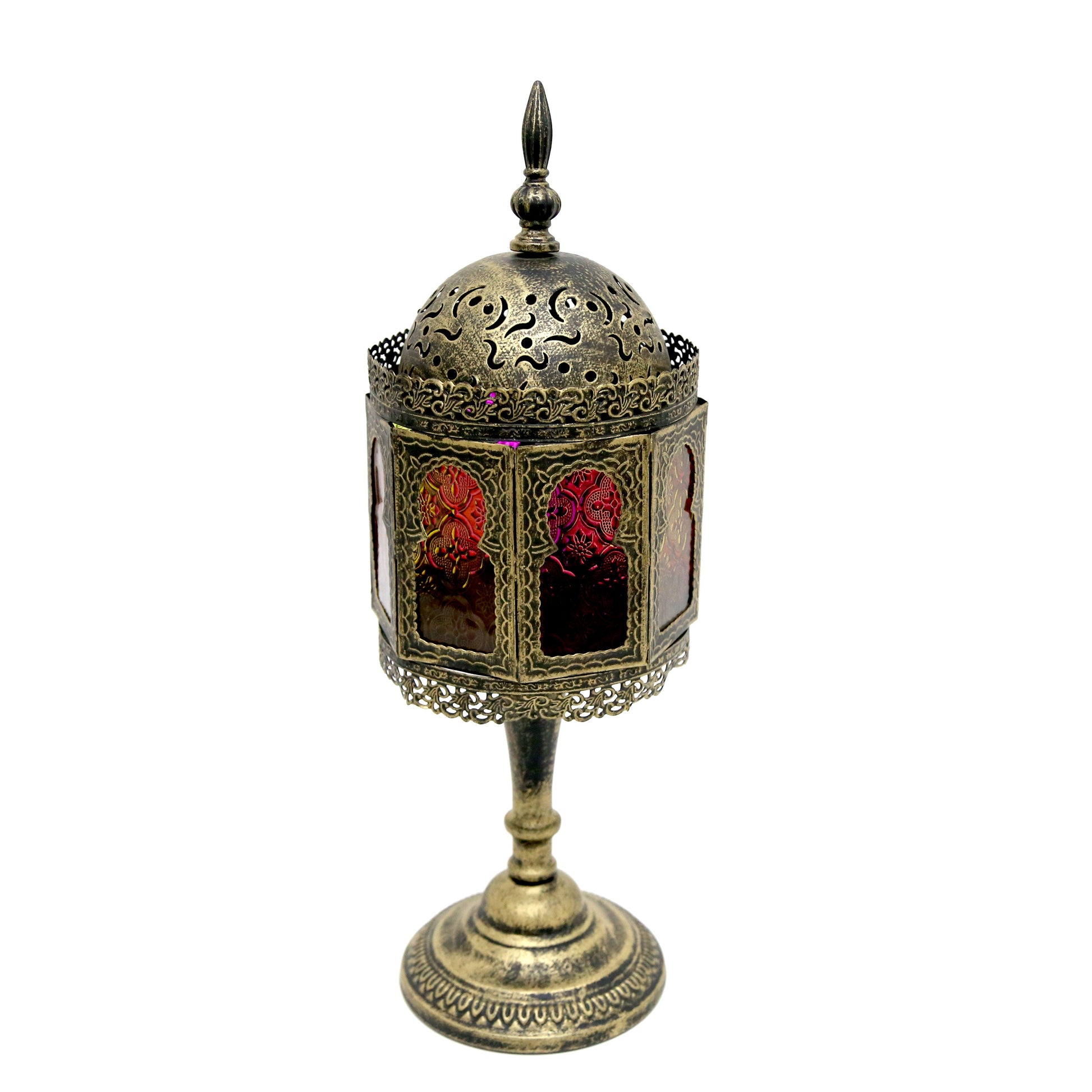 19" (48 CM) Tall metal lantern with multicolored glass windows.