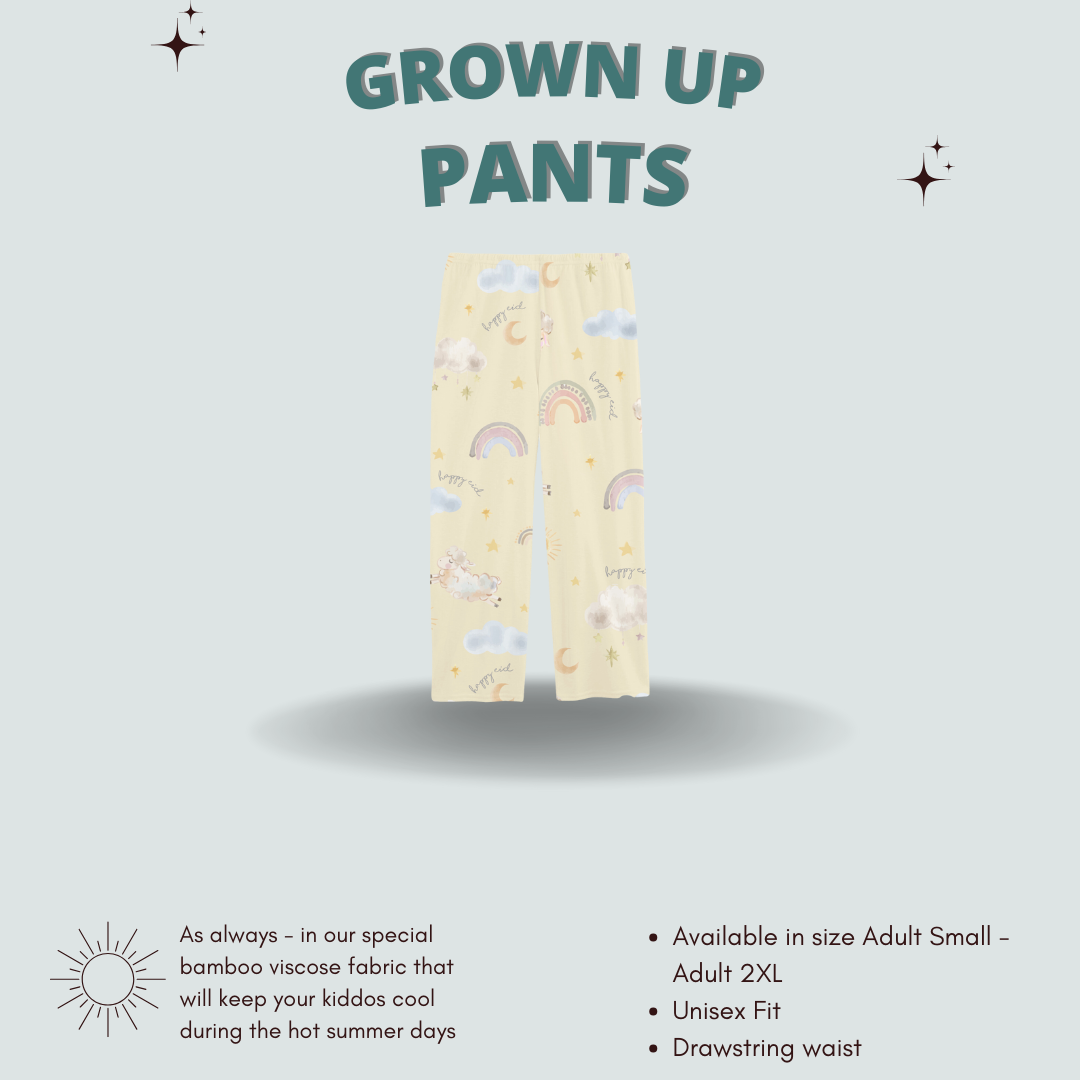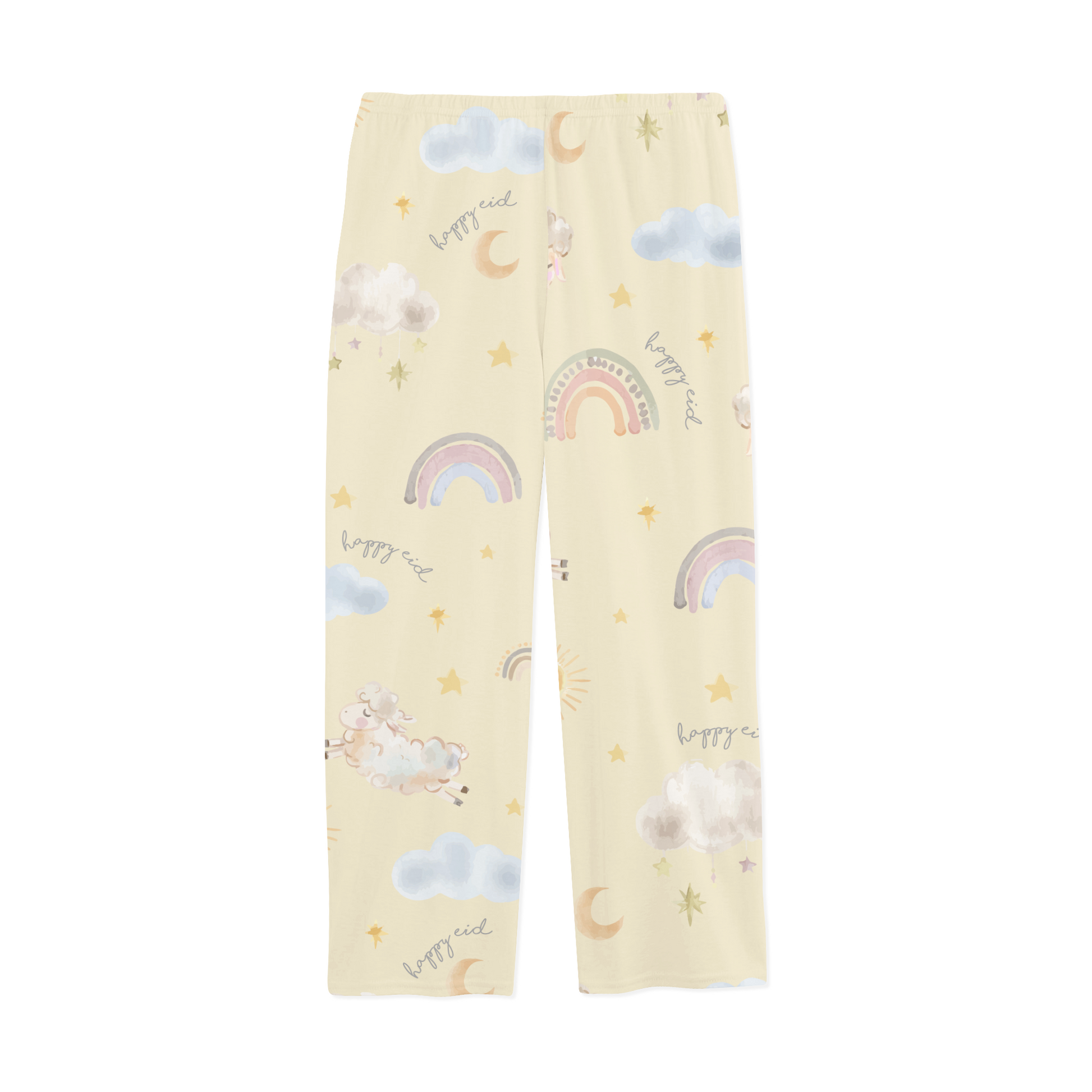 Dream of Eid with our Eid Dreams Adult PJ Pants, where comfort meets style in the most dreamy way possible. Made from soft bamboo fabric, these pants are a luxurious treat for your skin. Adorned with delightful imagery of sheep and clouds, they whisk you away to a realm of joyous Eid festivities and tranquil dreams. Designed to fit both men and women, these pants feature a relaxed fit and an elastic waistband for unrestricted movement.