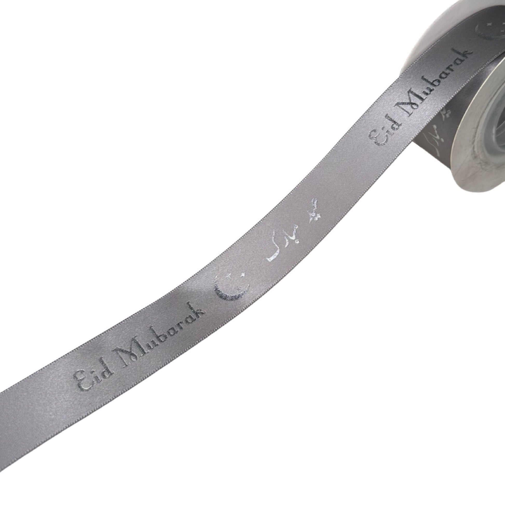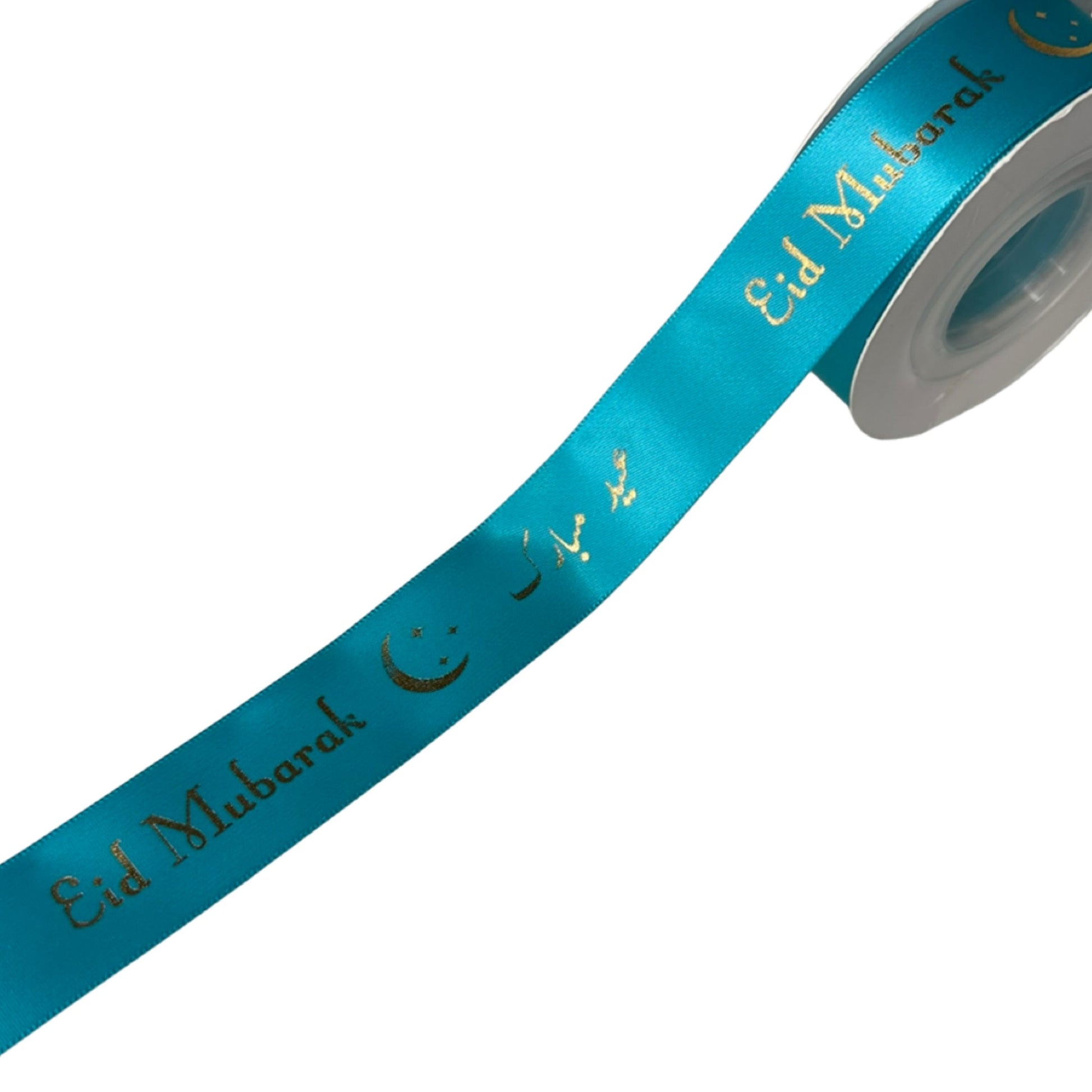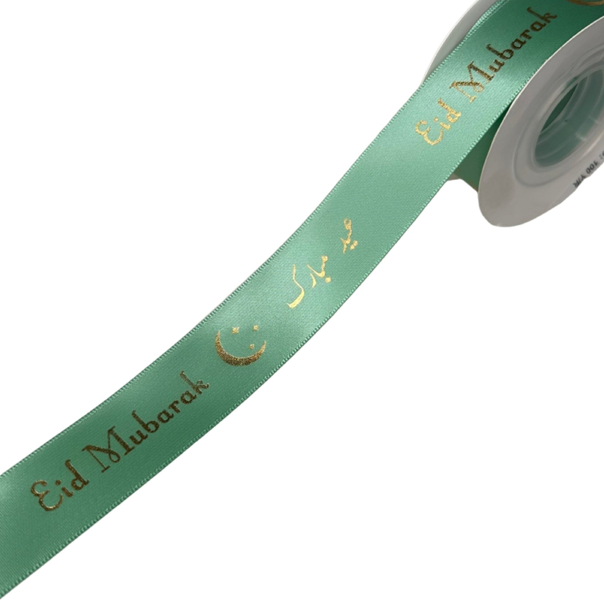 A wide range of colored satin ribbon beautifully printed in a shiny metallic stamp. Eid Mubarak, both in English and Arabic is printed on the ribbon alongside with a mosque icon.