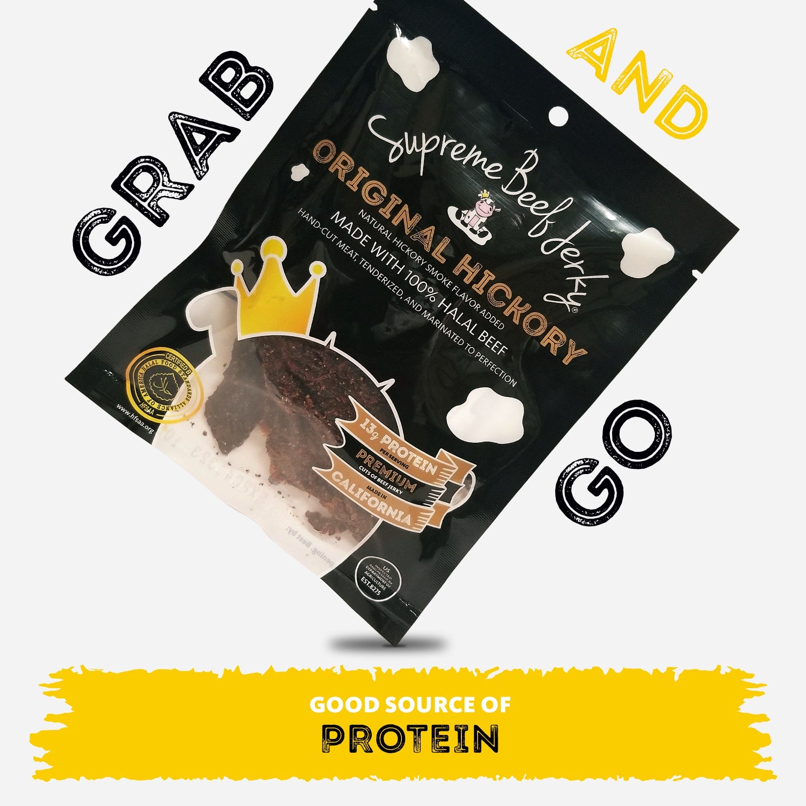 Supreme Beef Jerky offers a gourmet Halal beef jerky made with bold original hickory flavor. 2.5 ounces of premium jerky come packaged in a resealable bag for easy storage. The jerky is made with humanely raised, source-verified Zabiha Halal beef. The beef is sourced from cattle farms with management practices that maintain the highest quality in Halal standards. Prime cuts of 100% USDA meat are selected and marinated to perfection. All-natural ingredients are used to offer the perfect taste in every bite.