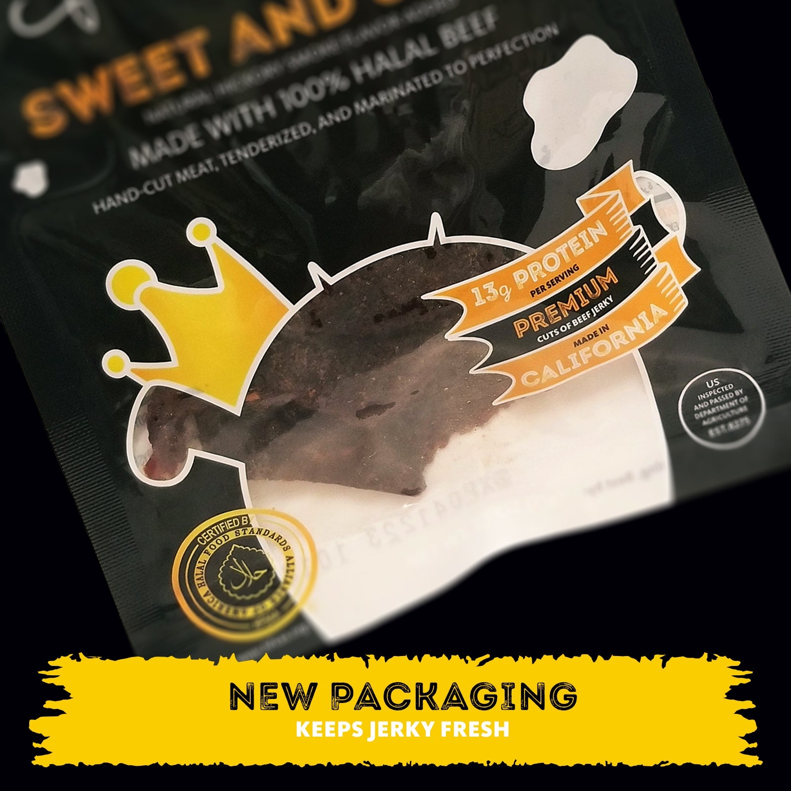 HALAL BEEF JERKY, MARINATED SWEET AND SPICY BEEF JERKY, HANDCRAFTED GOURMET MEAT SNACKS, 2.5 OZ (SWEET AND SPICY)