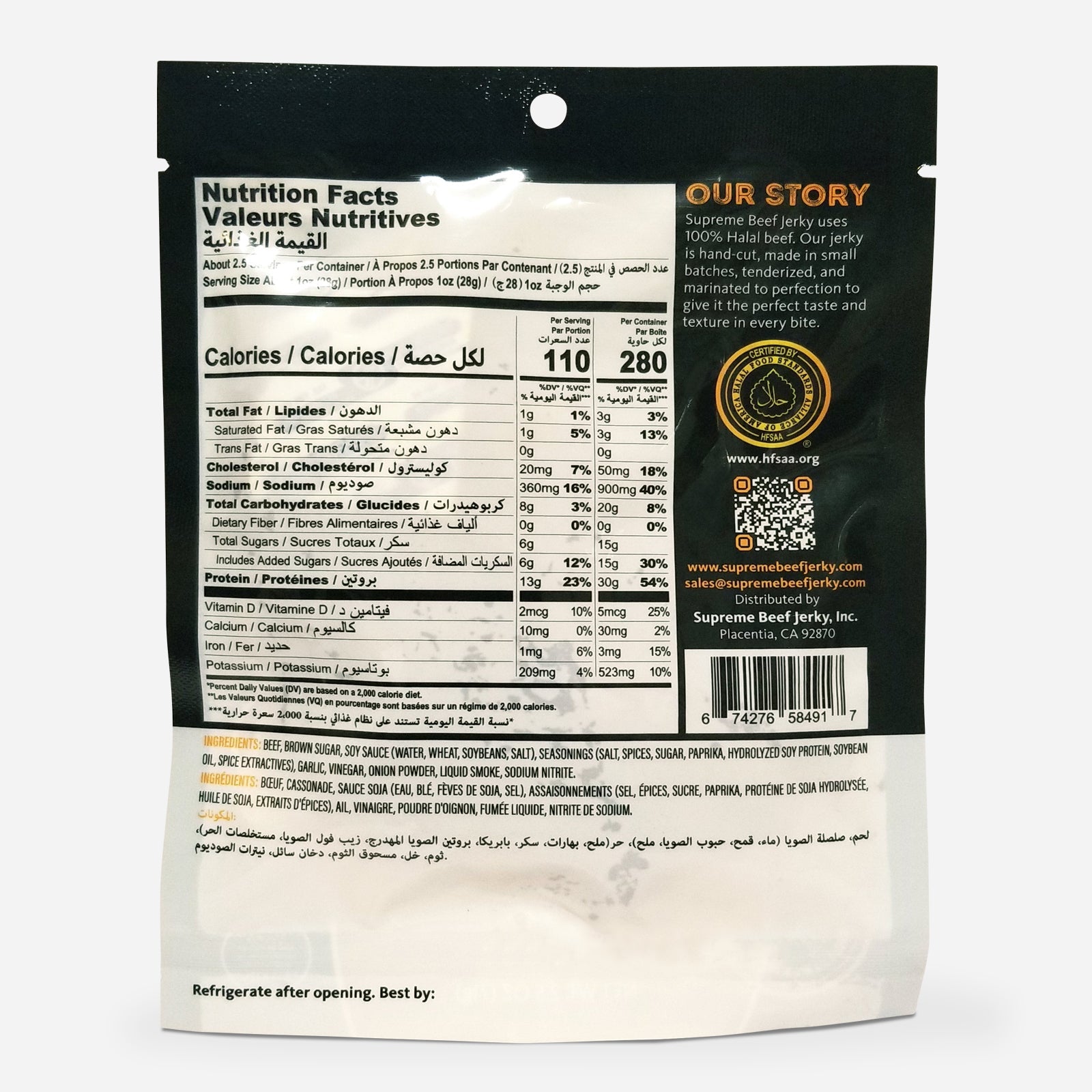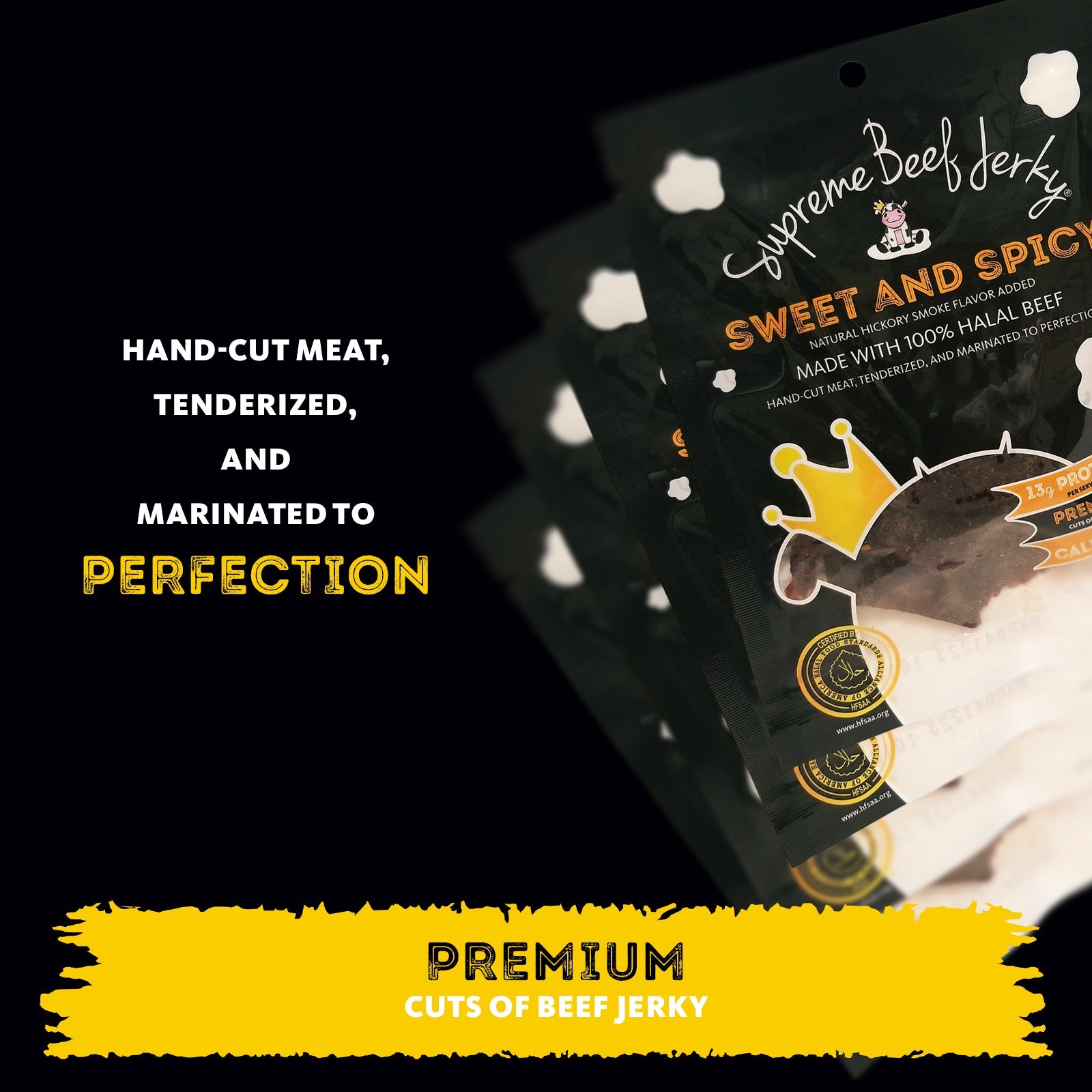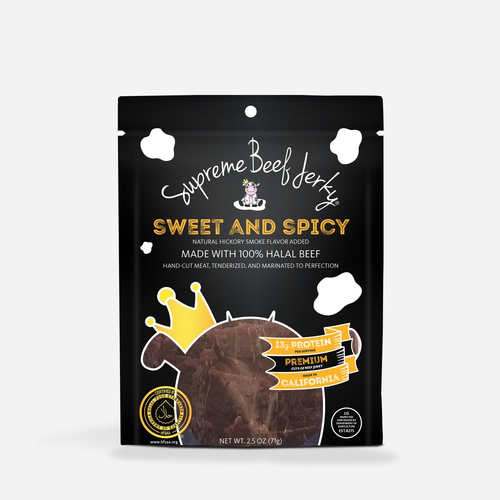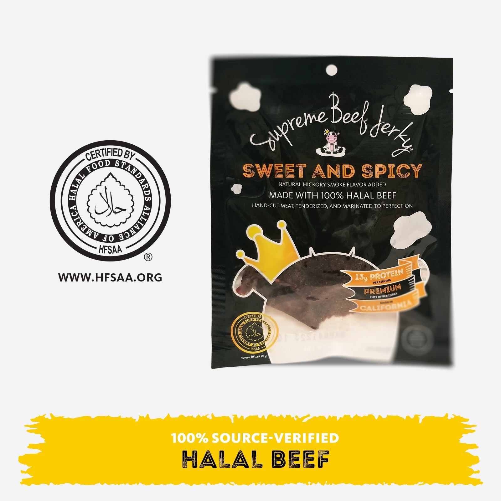 Supreme Beef Jerky offers a gourmet Halal beef jerky made with bold sweet and spicy flavor. 2.5 ounces of premium jerky come packaged in a resealable bag for easy storage. The jerky is made with humanely raised, source-verified Zabiha Halal beef. The beef is sourced from cattle farms with management practices that maintain the highest quality in Halal standards. Prime cuts of 100% USDA meat are selected and marinated to perfection. All-natural ingredients are used to offer the perfect taste in every bite.