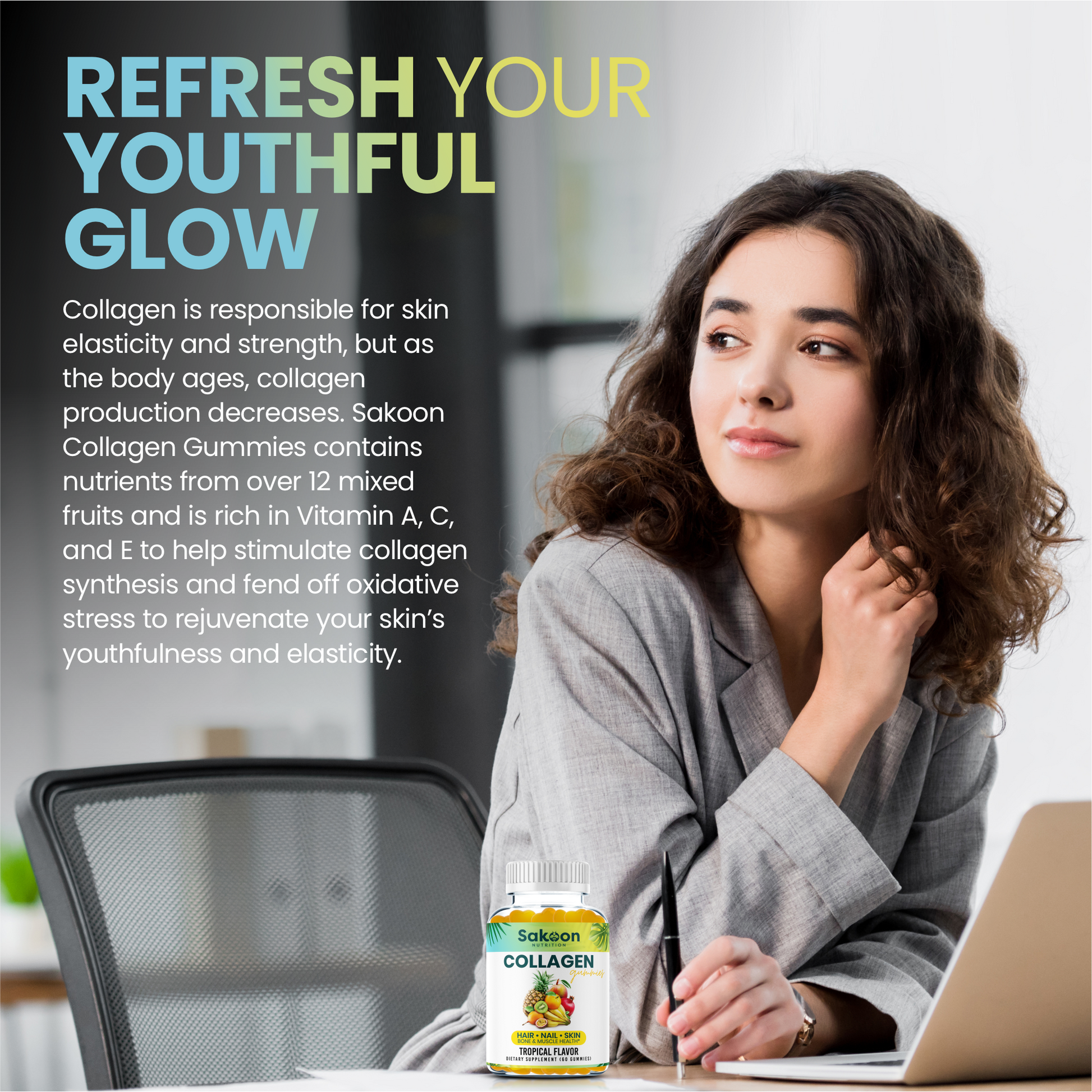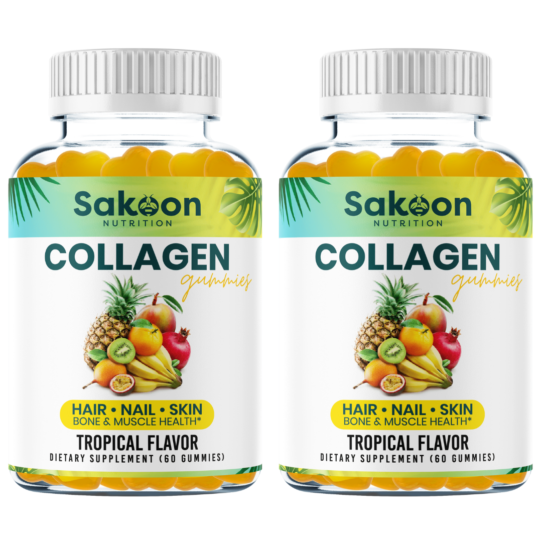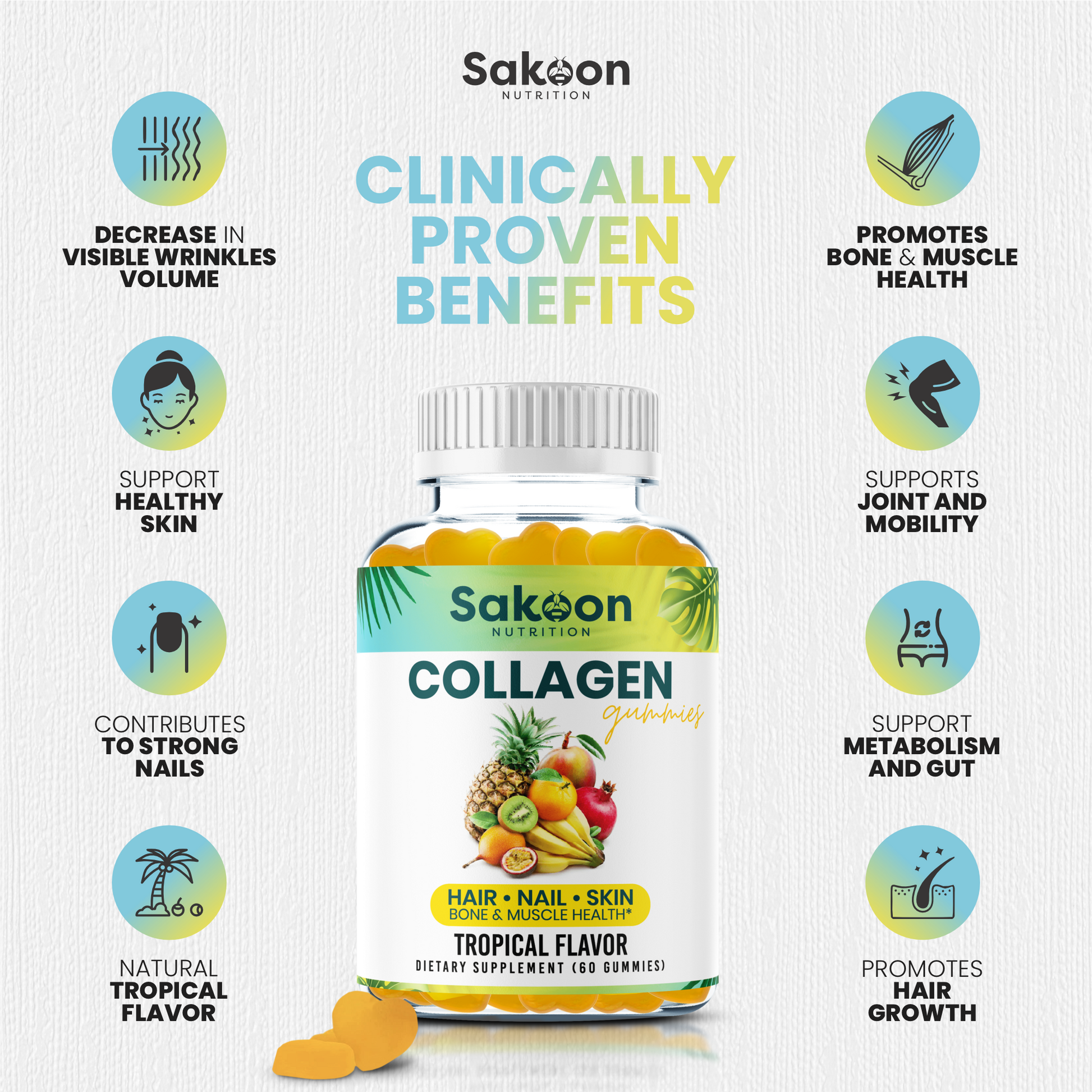 Collagen Gummies for Youthful Skin, Nails, Hair 60 ct - Anti-Aging to Restore Youthful Elasticity, Strengthens Nails, Bones, Muscles. Tropical Fruit Flavor, Safe & Made in USA