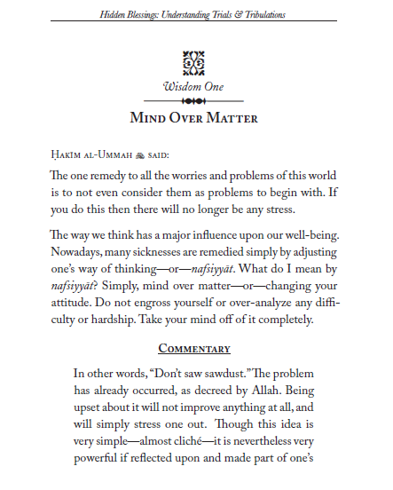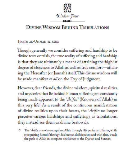 Hidden within every hardship and difficulty are innumerable spiritual bounties. Once this reality is recognized, a believer will be able to successfully navigate even the most difficult ordeals. As the first book of the Wisdom of Hakim al-Ummah series, this brief anthology unveils many of the secrets that are concealed in some of the greatest struggles of life. Collected from the works of the Great Sage of the Ummah, Mawlana Muhammad Ashraf Ali Thanwi and other great scholars, readers are sure to benefit from a complete change in perspective that will, insha Allah, allow them to face the most challenging moments of their lives.