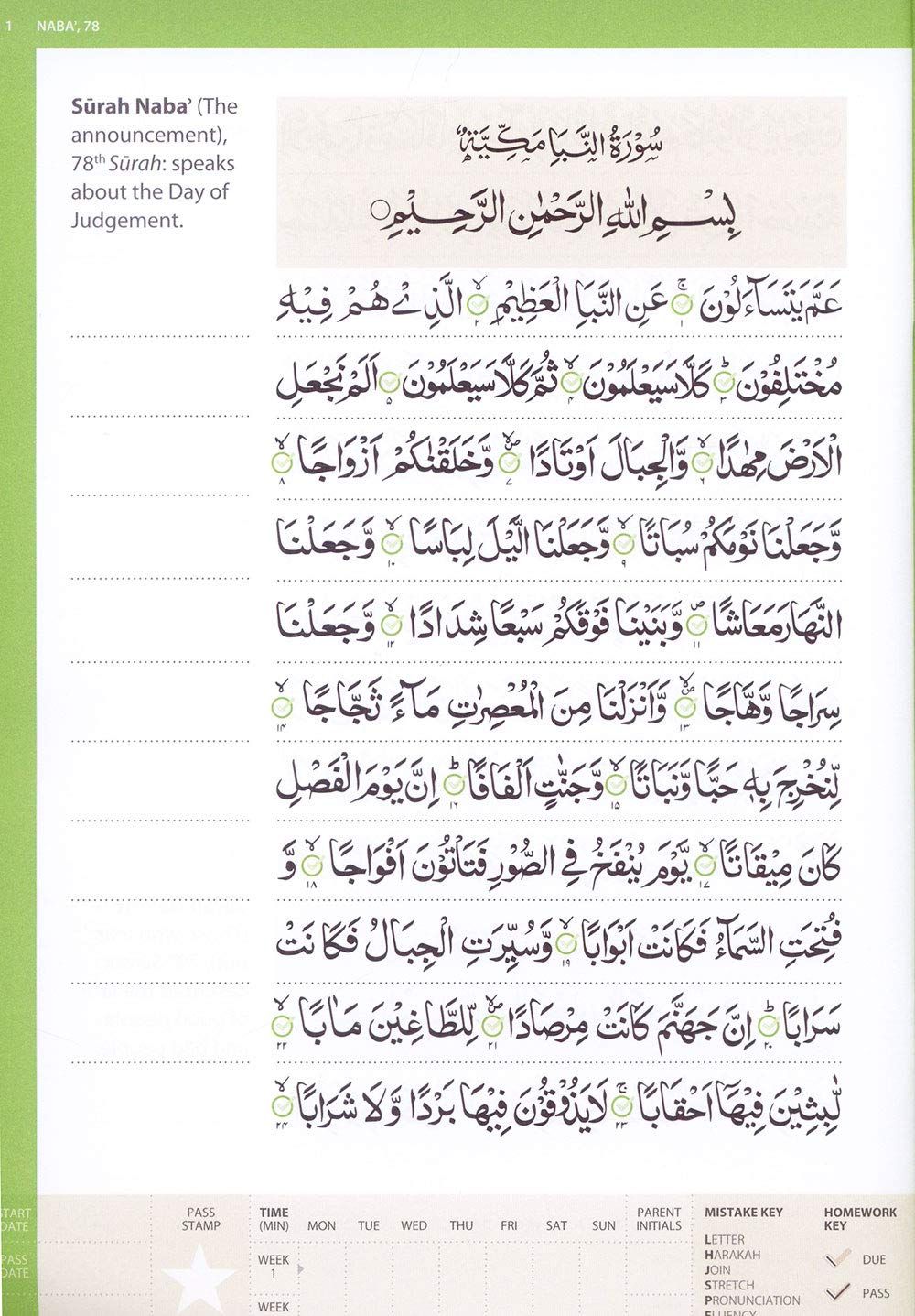 Unlike other contemporary Juz' 'Ammas, this book has been published with the Surahs in the correct Qur'anic order, to help students remember the sequence of Sarahs for performing Sabah correctly. Its script has been imported directly from the popular 13-line Qur'an that is used throughout the world. The text is not colour-coded for Tajwid rules, so that students are able to read black and white Qur'ans without such aids.