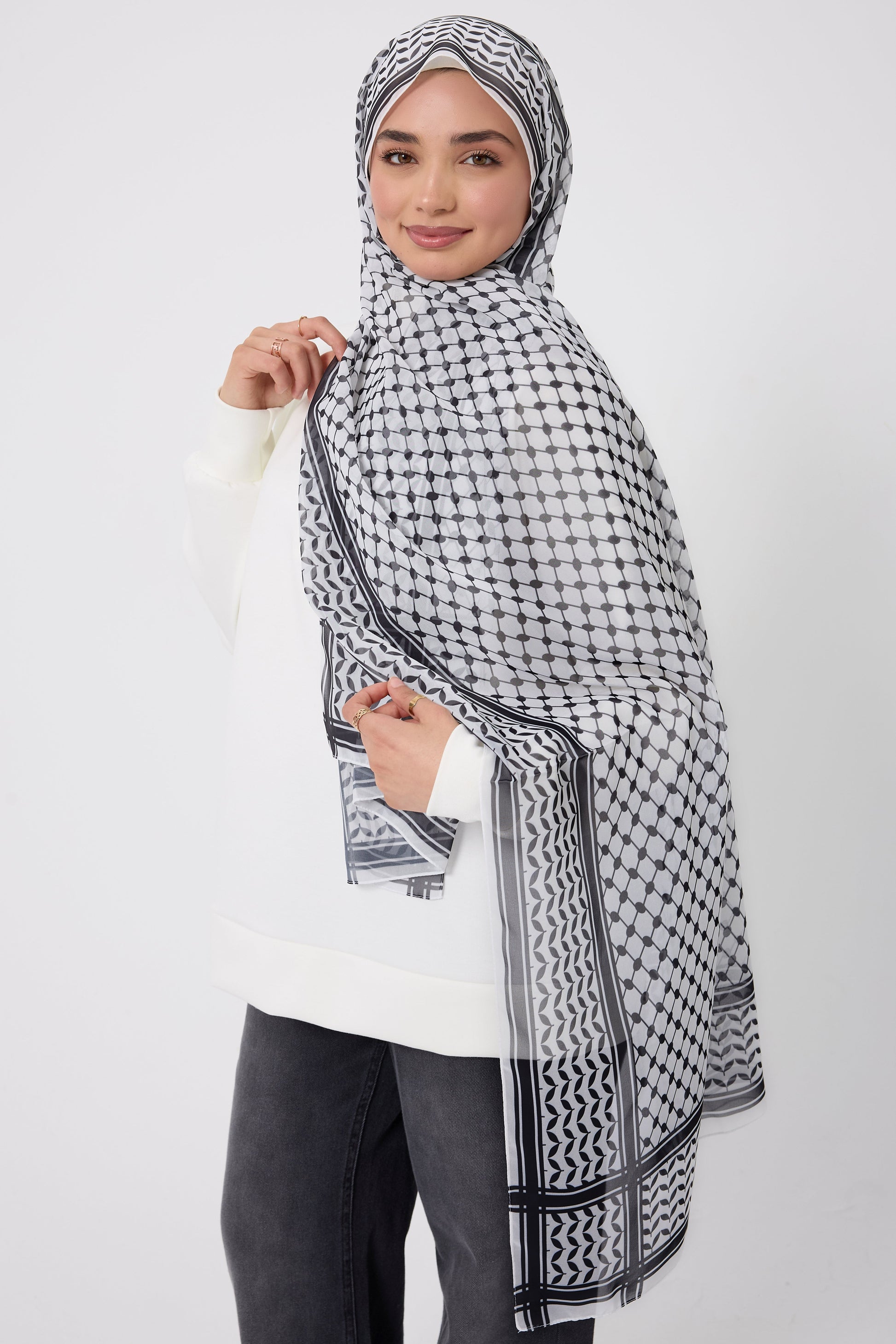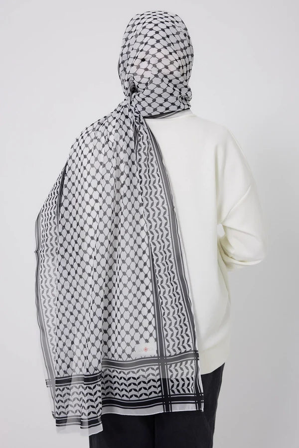 Akoya’s Keffiyeh Printed Chiffon Hijab is crafted from premium textured chiffon that flows with grace and holds with ease. This is more than a design it’s symbol of solidarity. The iconic keffiyeh pattern, deeply rooted in Palestinian identity, carries with it a message of resilience, dignity, and unshakable hope. It’s a statement of heritage and strength designed for the woman who carries both grace and purpose.