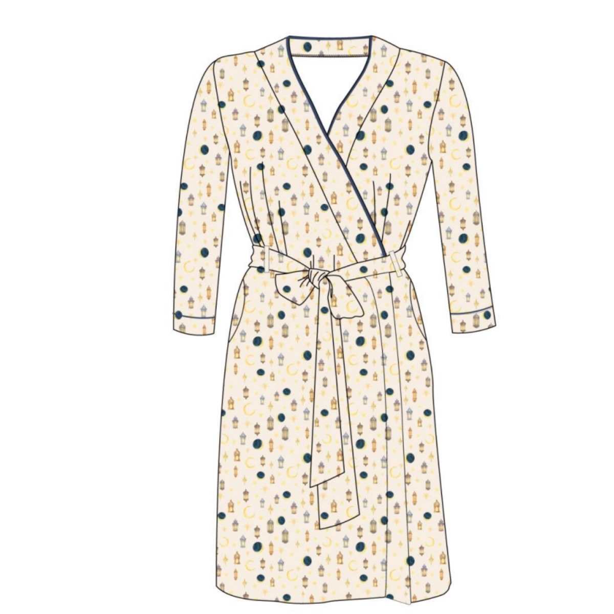 Light the night with Jasmine + Marigold’s eastern inspired pajamas and robes. Make memories and celebrate Ramadan with your entire family in Jasmine + Marigold’s stretchy and soft bamboo Eid and Ramadan collection. Our new collection features the phases of the moon, lanterns, and stars to truly have a starry Ramadan. This neutral "oat" colorway features navy piping for an elegant, elevated look. Ideal for lounging or layering over our Eid PJs, the Luxe Bamboo Robe is composed of buttery-soft bamboo viscose that is the perfect blend of comfort and luxury.