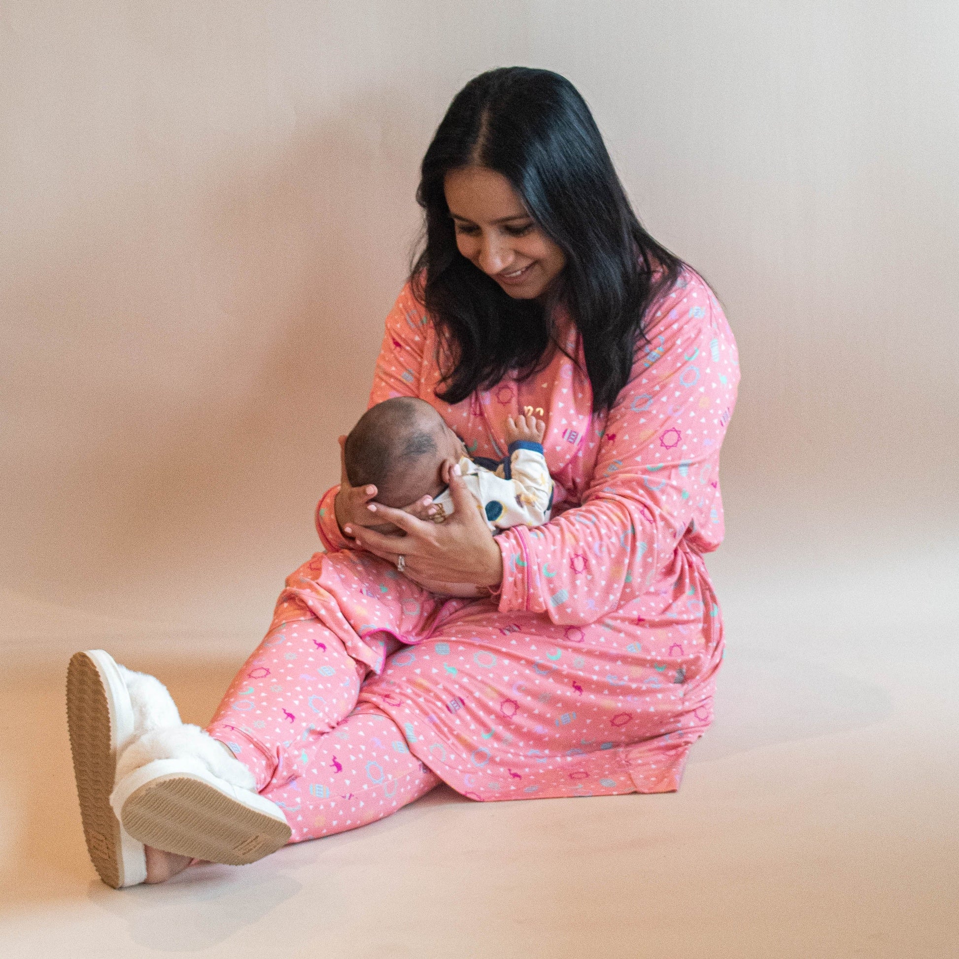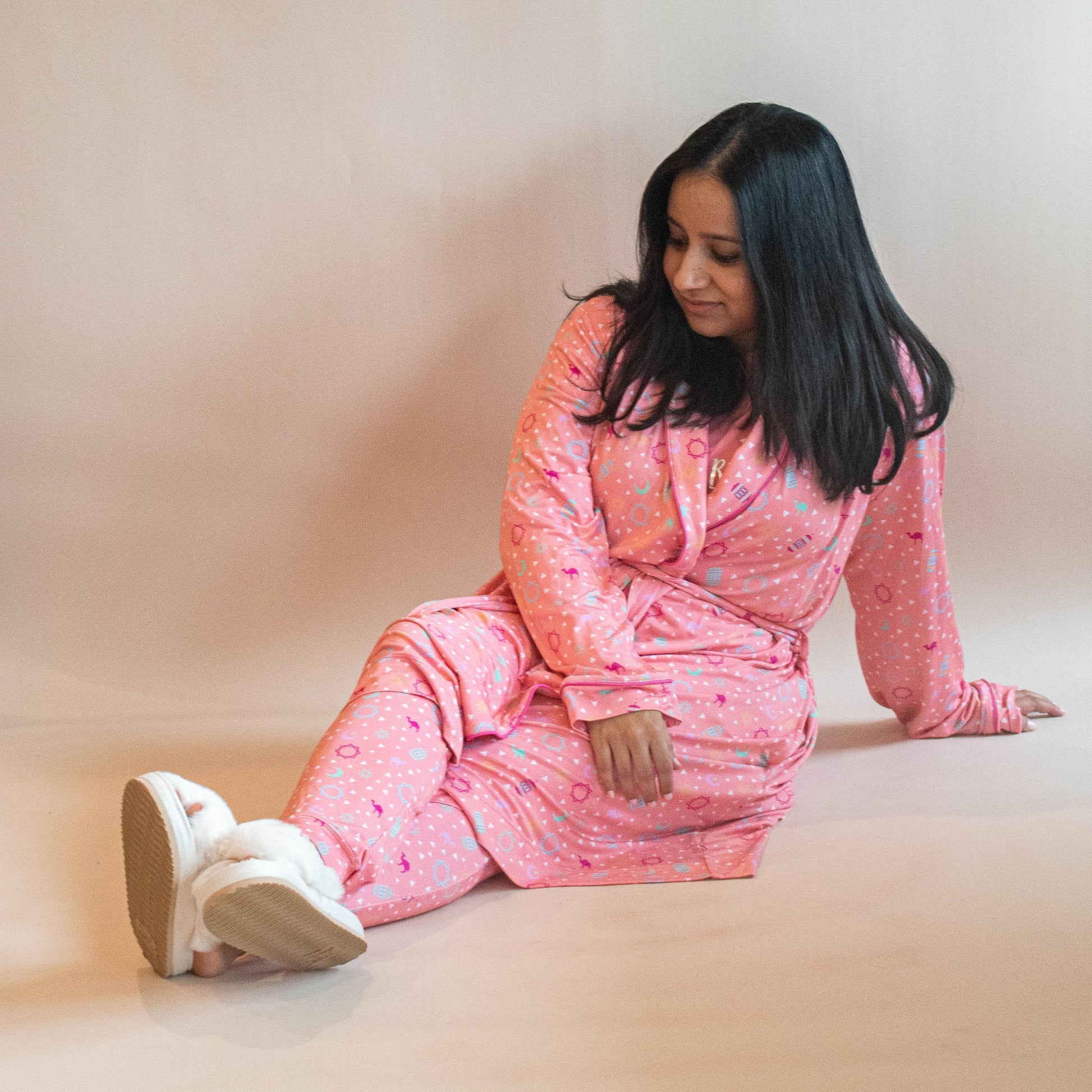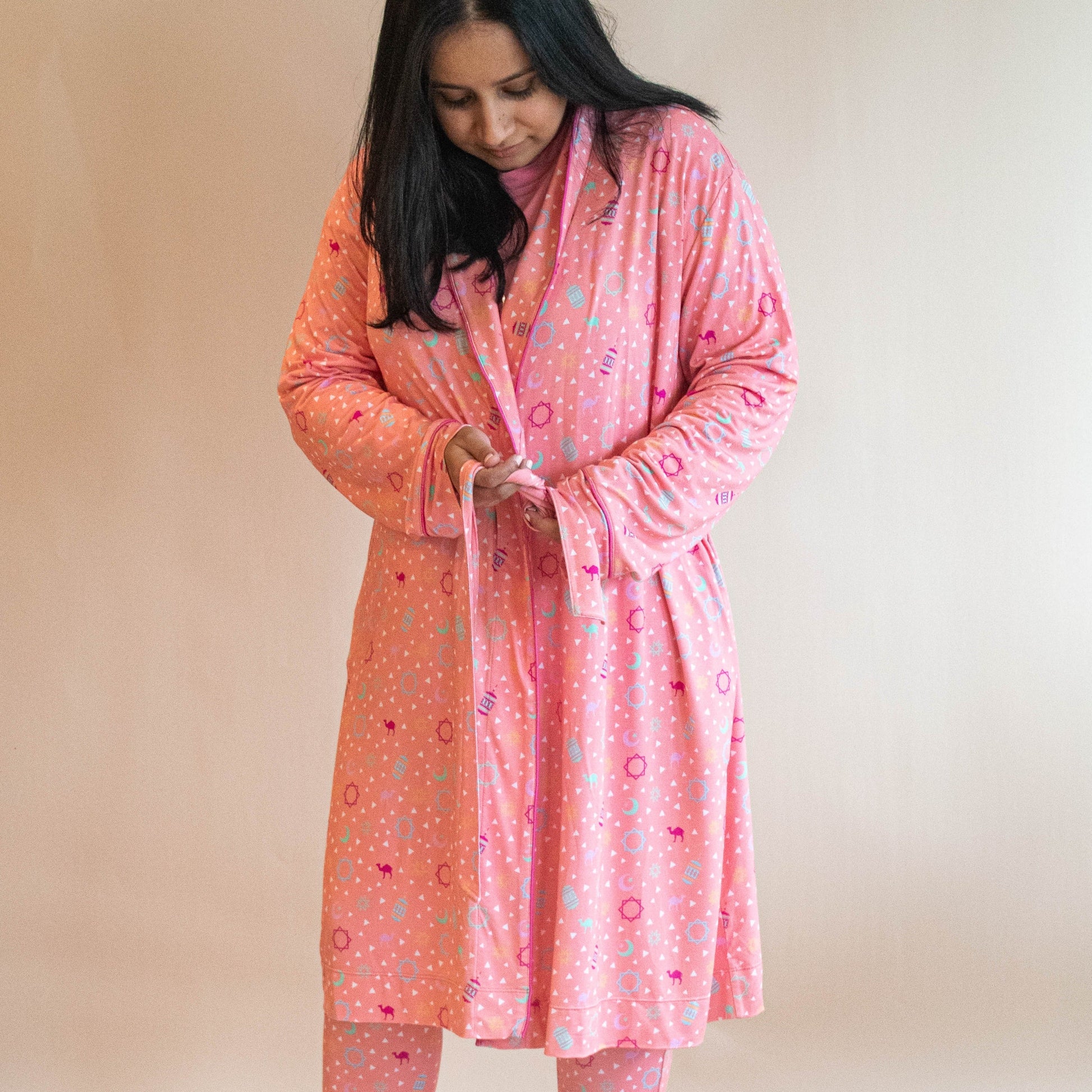Pretty in pink in Jasmine + Marigold’s geometric tesselation robe. Our new collection features the phases of the moon, lanterns, and stars to truly have a starry night. This gorgeous pink robe is Ideal for lounging or layering over our PJs, the Luxe Bamboo Robe is composed of buttery-soft bamboo viscose that is the perfect blend of comfort and luxury. Match with our ruffle romper or pajama sets.