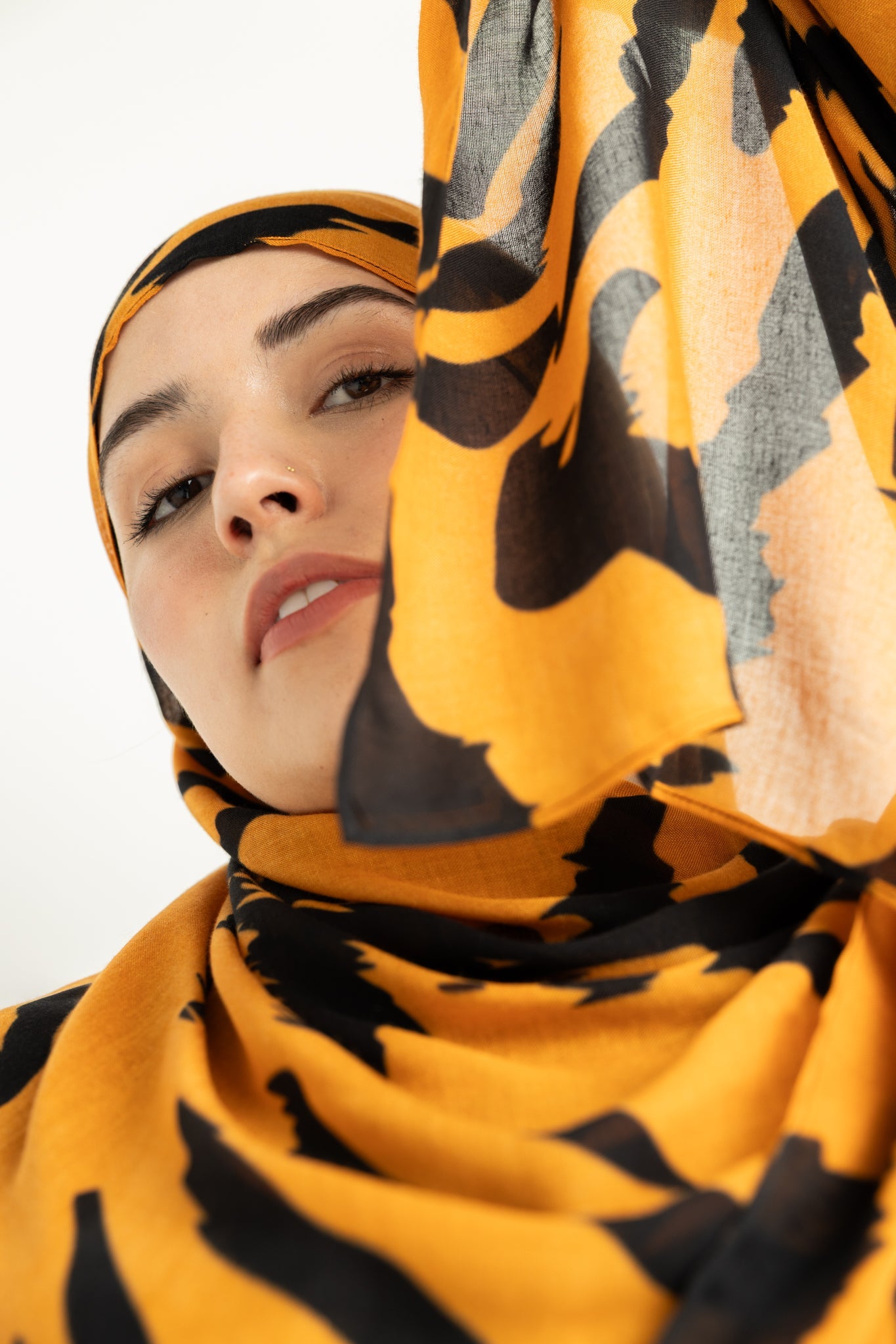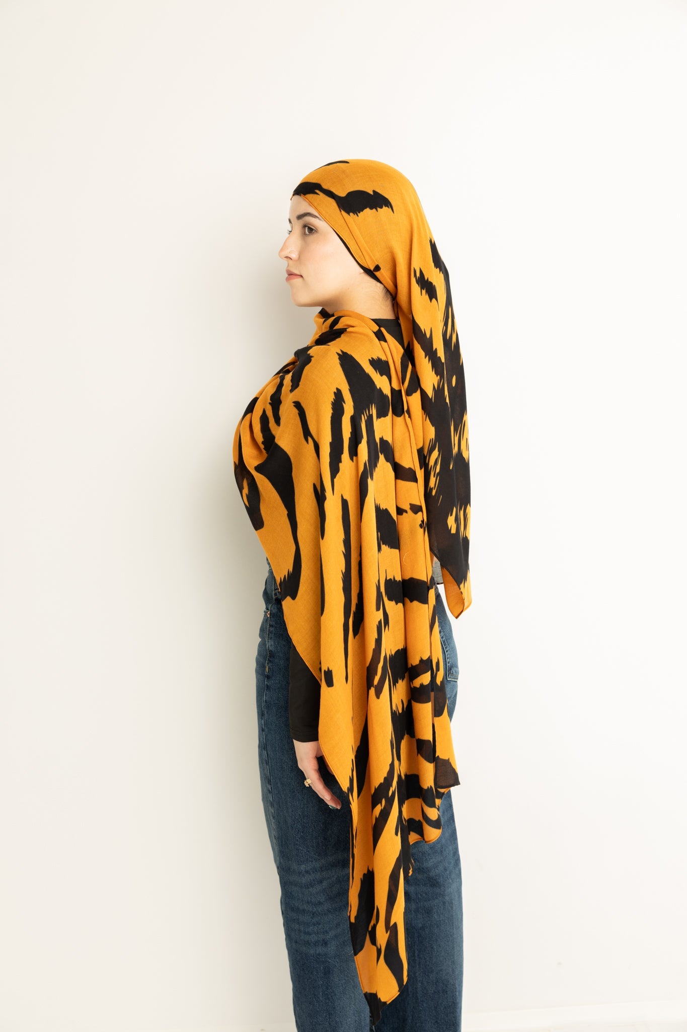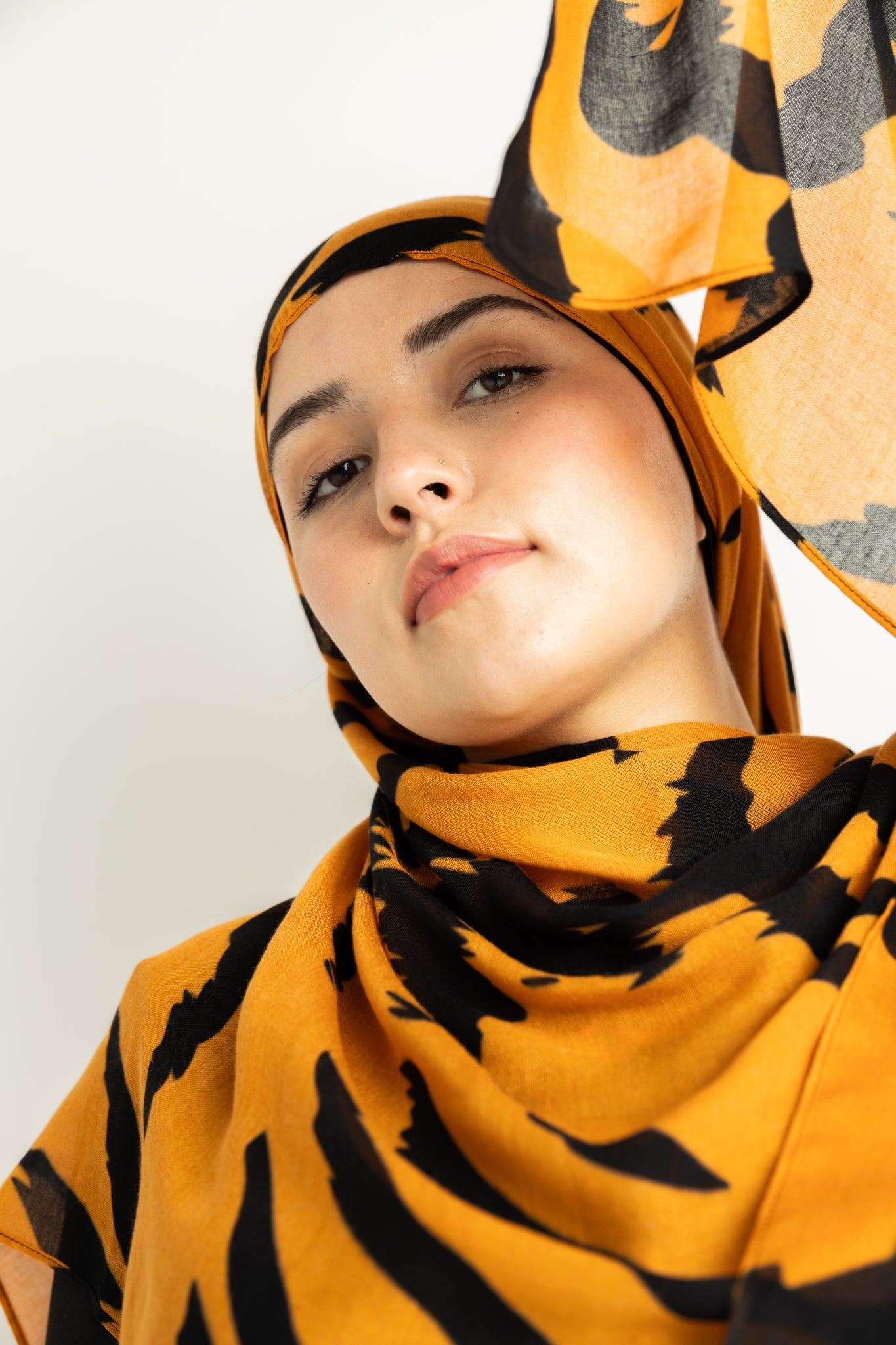Unleash your fierce side with the Tiger Stripes modal hijab, a striking blend of deep gold and bold black that embodies both power and elegance. The dynamic pattern draws inspiration from the untamed beauty of nature, creating a piece that is both daring and graceful. Whether you're elevating a casual outfit or making a bold statement at an event, this hijab is sure to turn heads. Its lightweight, flowy fabric provides comfort and versatility, making it the perfect balance between fashion and function.