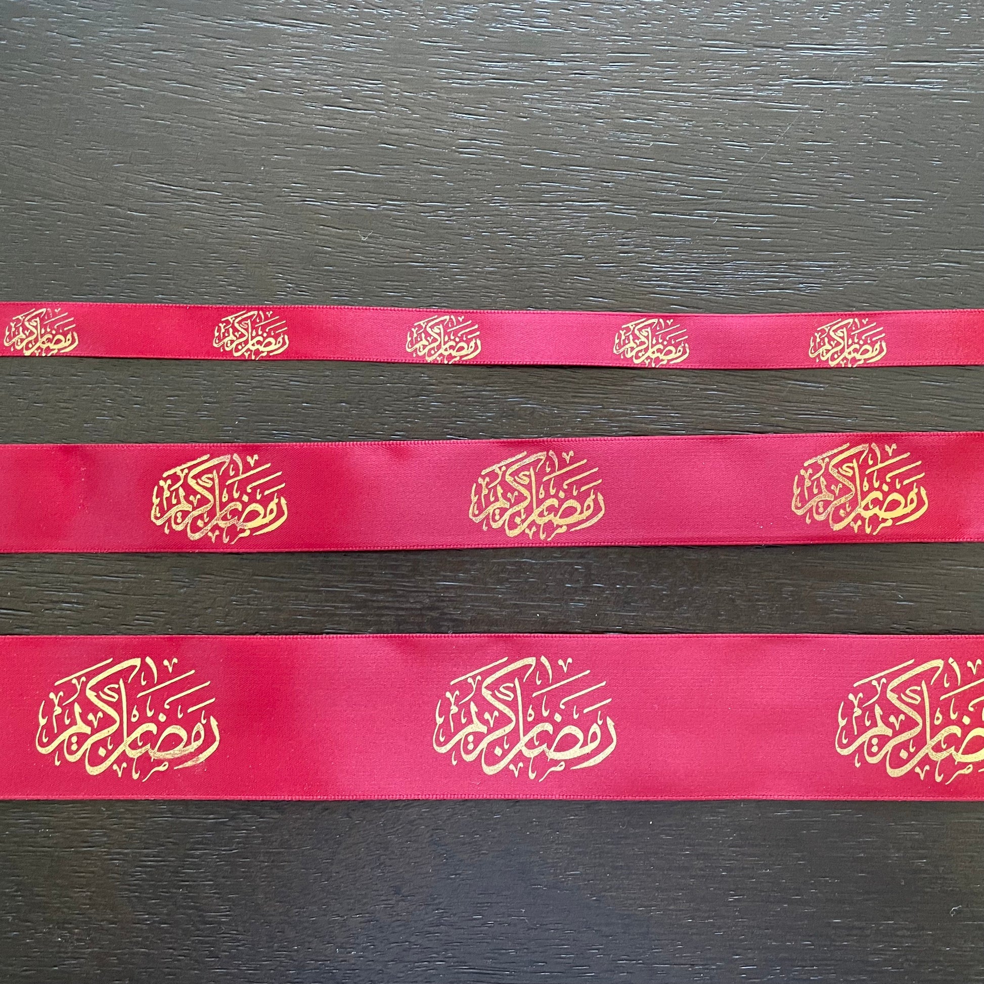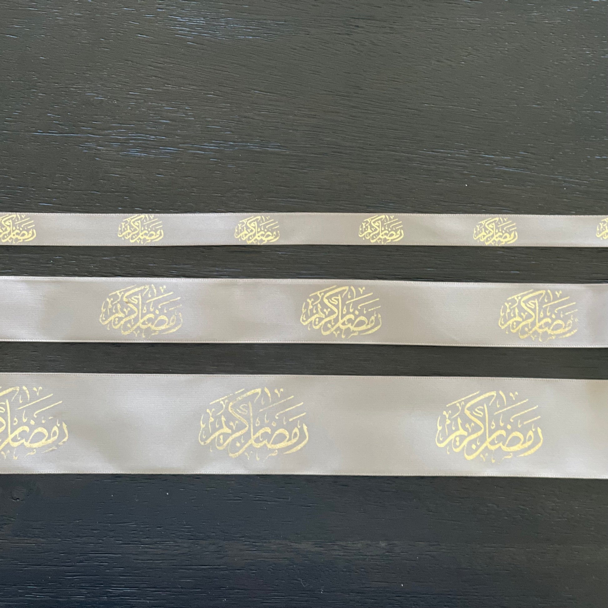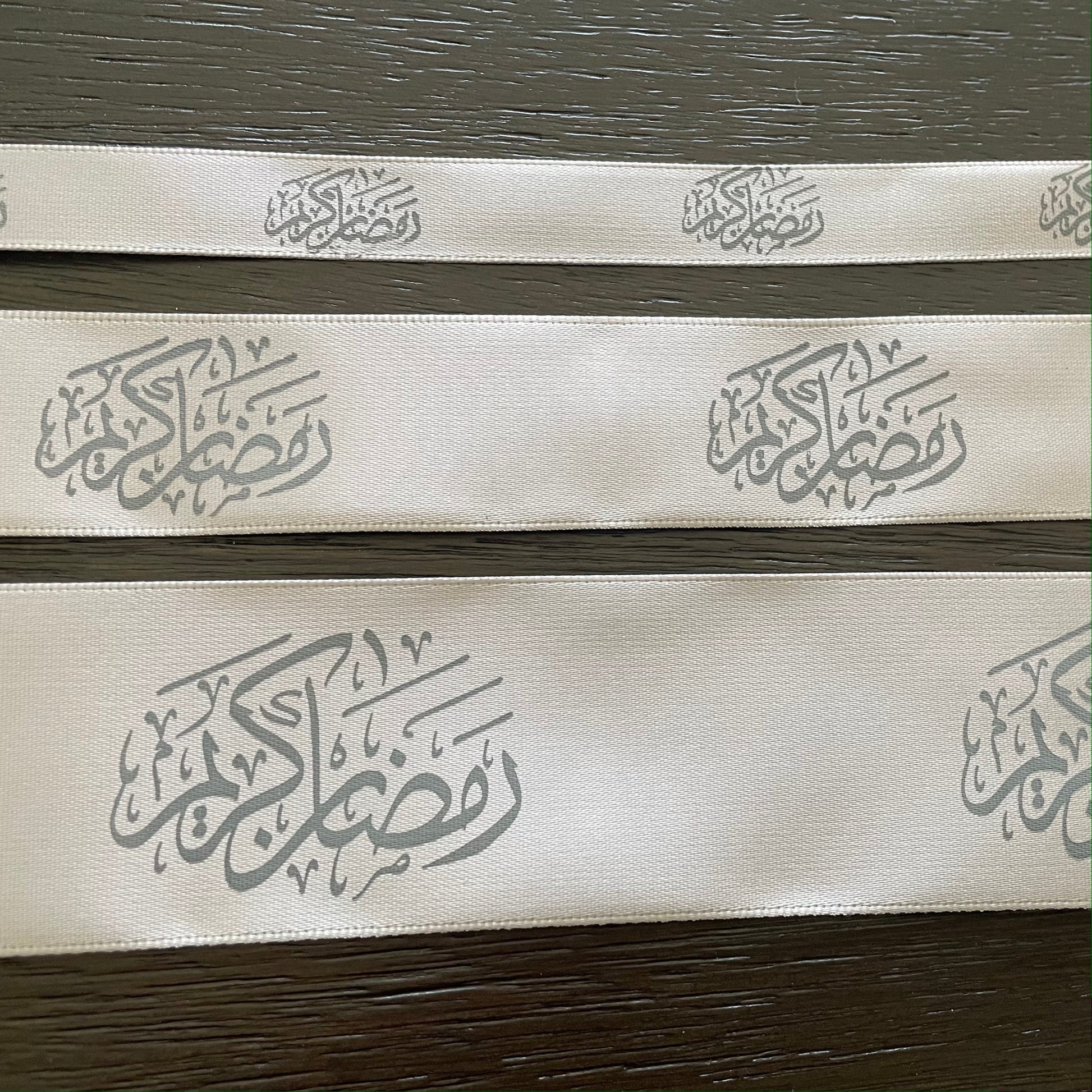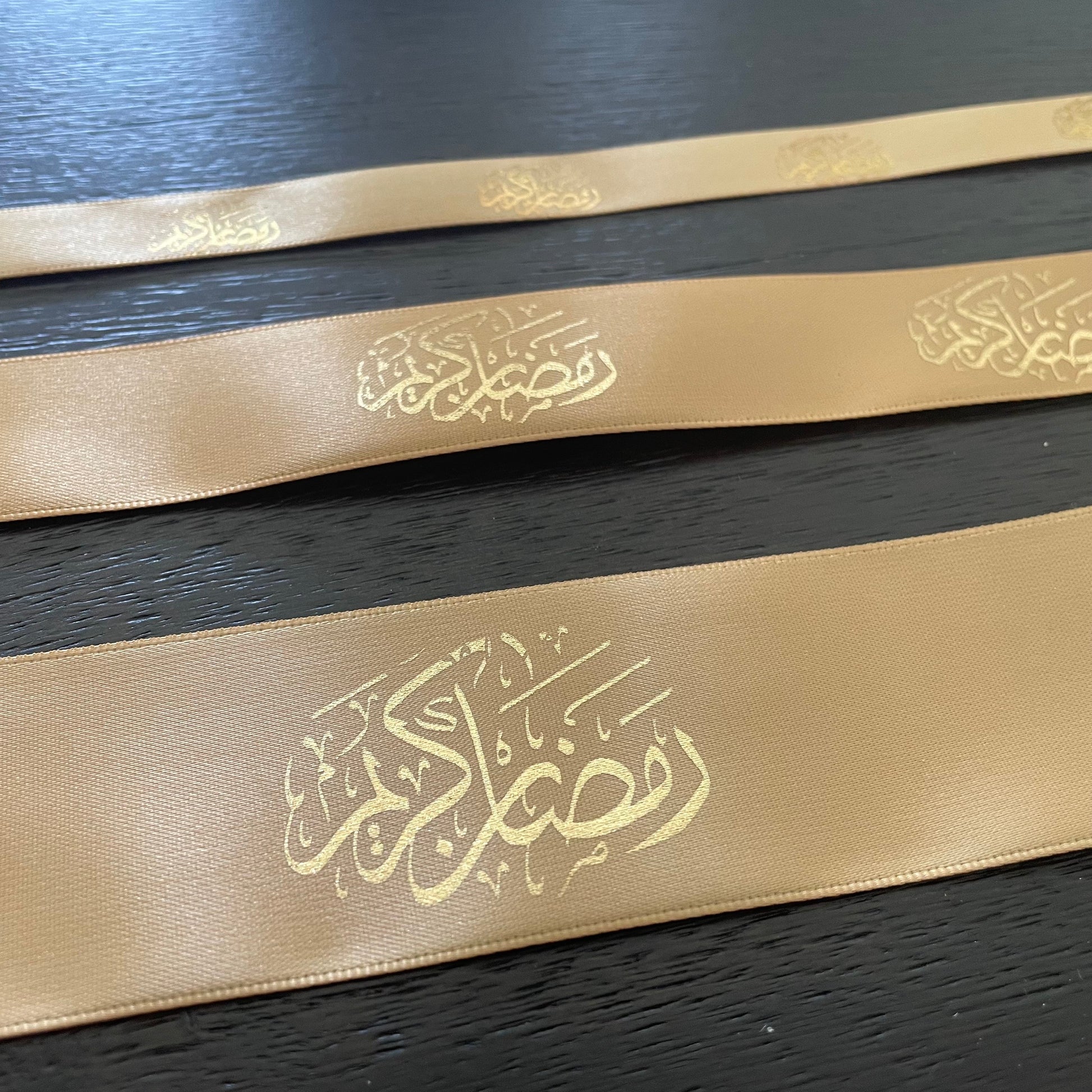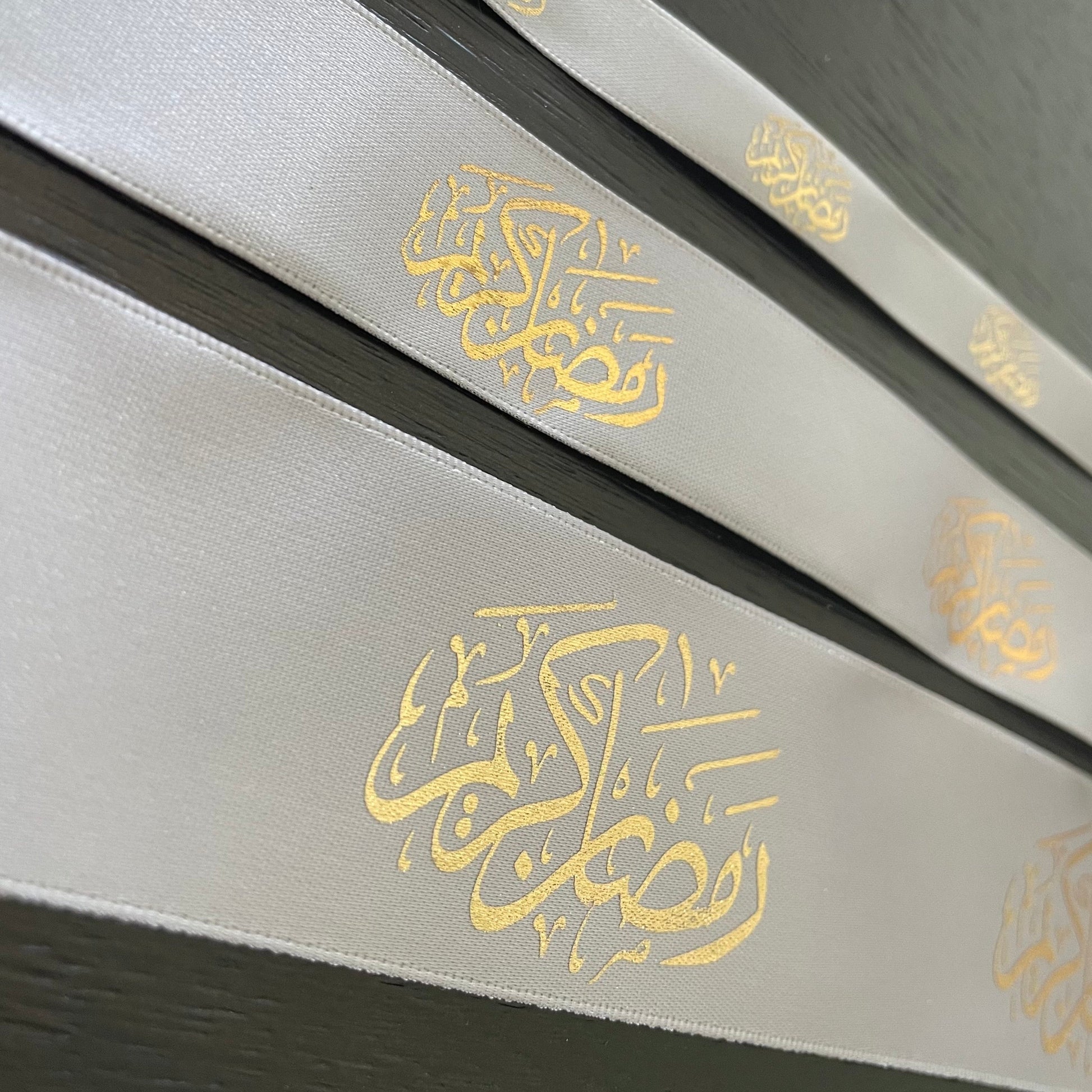 High end satin ribbon roll of 33 meters long (36 yards). A luxurious print finish of the word Ramadan Kareem in Arabic calligraphy.