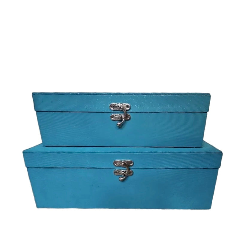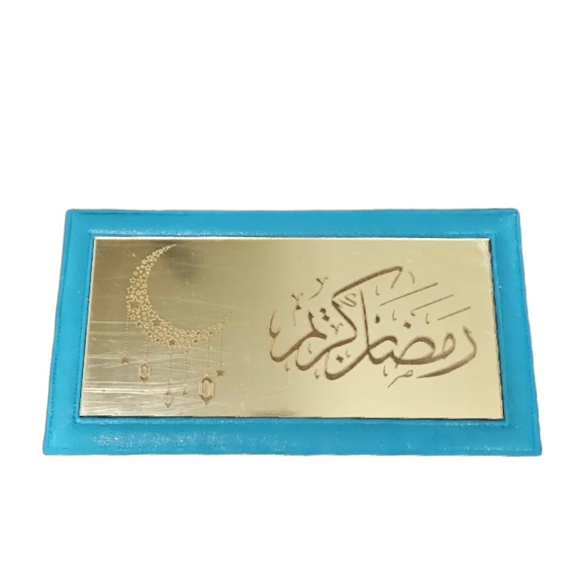Thick rectangular box. Upholstered in and out of fabric. Cover has a mirror like acrylic top with Ramadan Kareem carvings.