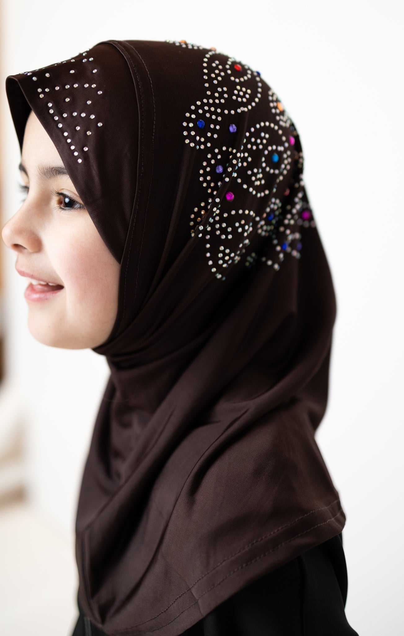Have your girls practice hijab at a young age! Each hijab is designed with embroidery, applique florals, and hotfixed jewels. Perfect for visits at the masjid, holidays, and Islamic schools.