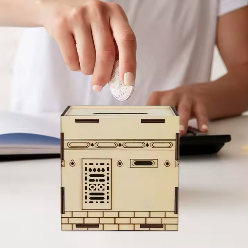 This beautifully crafted wooden box is designed to inspire children and adults alike, serving as both an engaging arts and crafts activity and a practical tool for saving money. Its Kaaba-inspired design allows you to teach kids about the importance of Hajj, Umrah, Zakat, or Sadaqa in a fun and meaningful way.