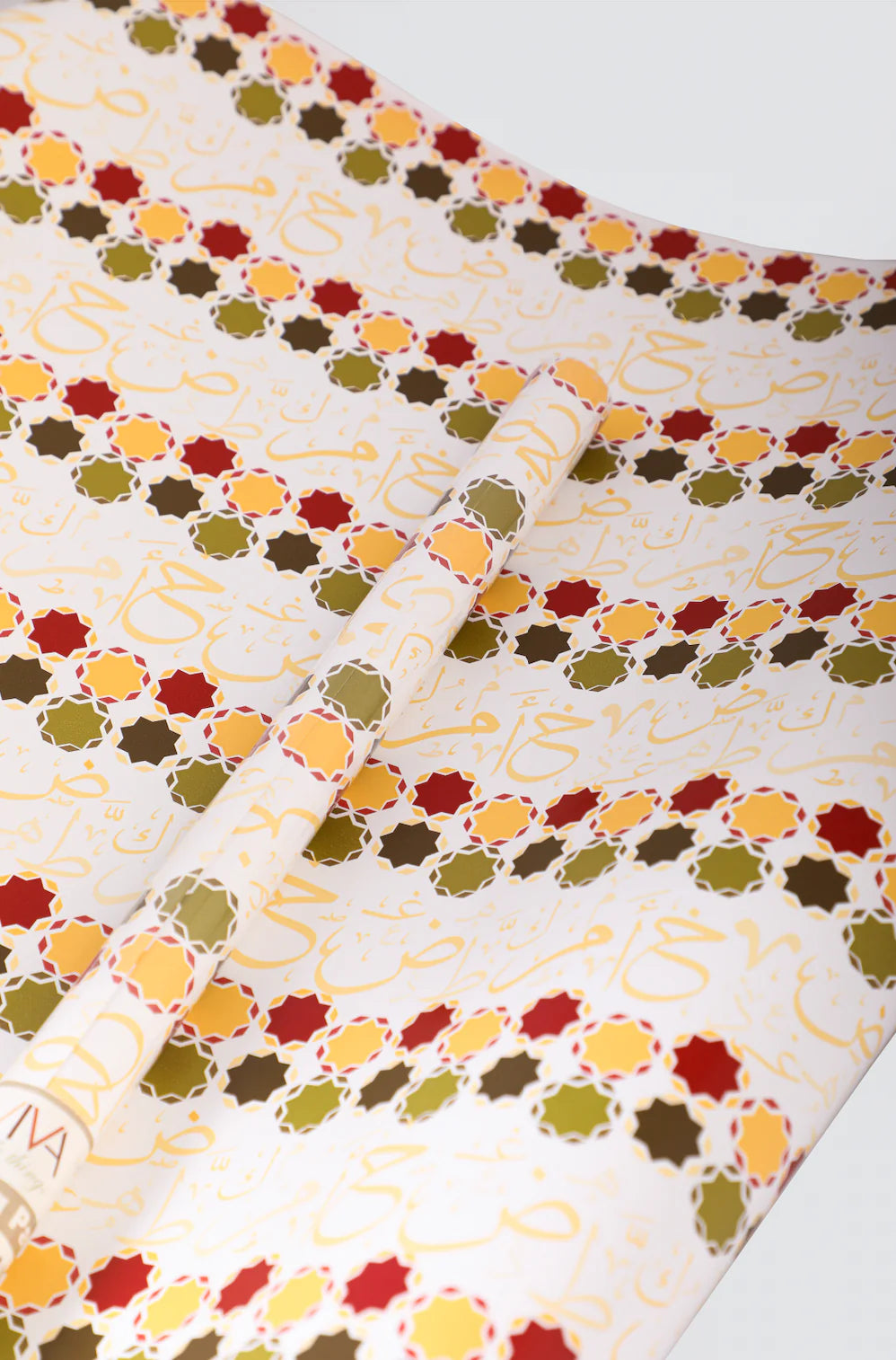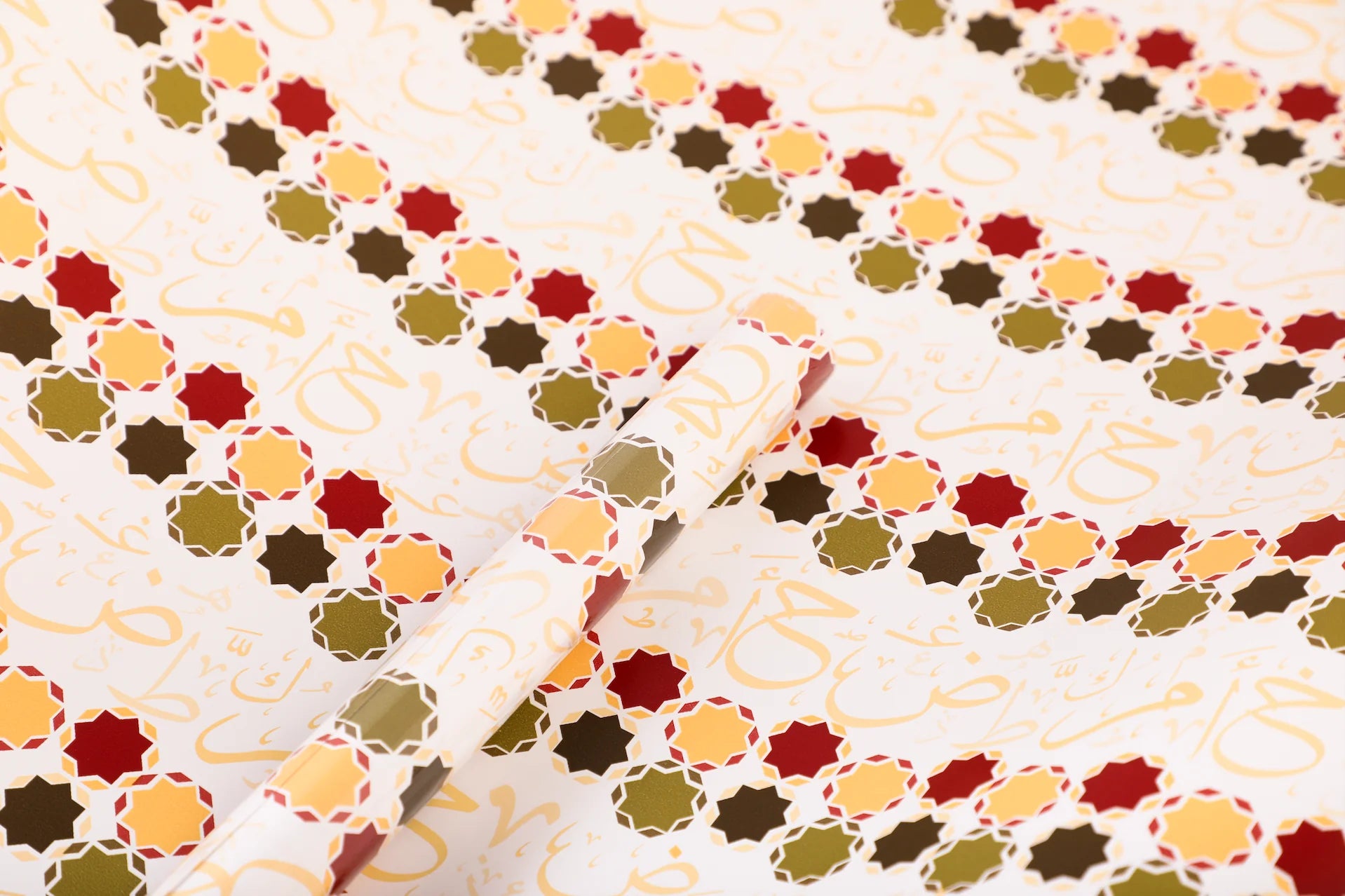 This luxury wrapping paper is an exquisite blend of modern and traditional, featuring a graceful Islamic star design and illuminated by beautiful Arabic Calligraphy. Its timeless, intricate pattern adds an air of distinction to any gift, marking a special occasion with a classic touch.