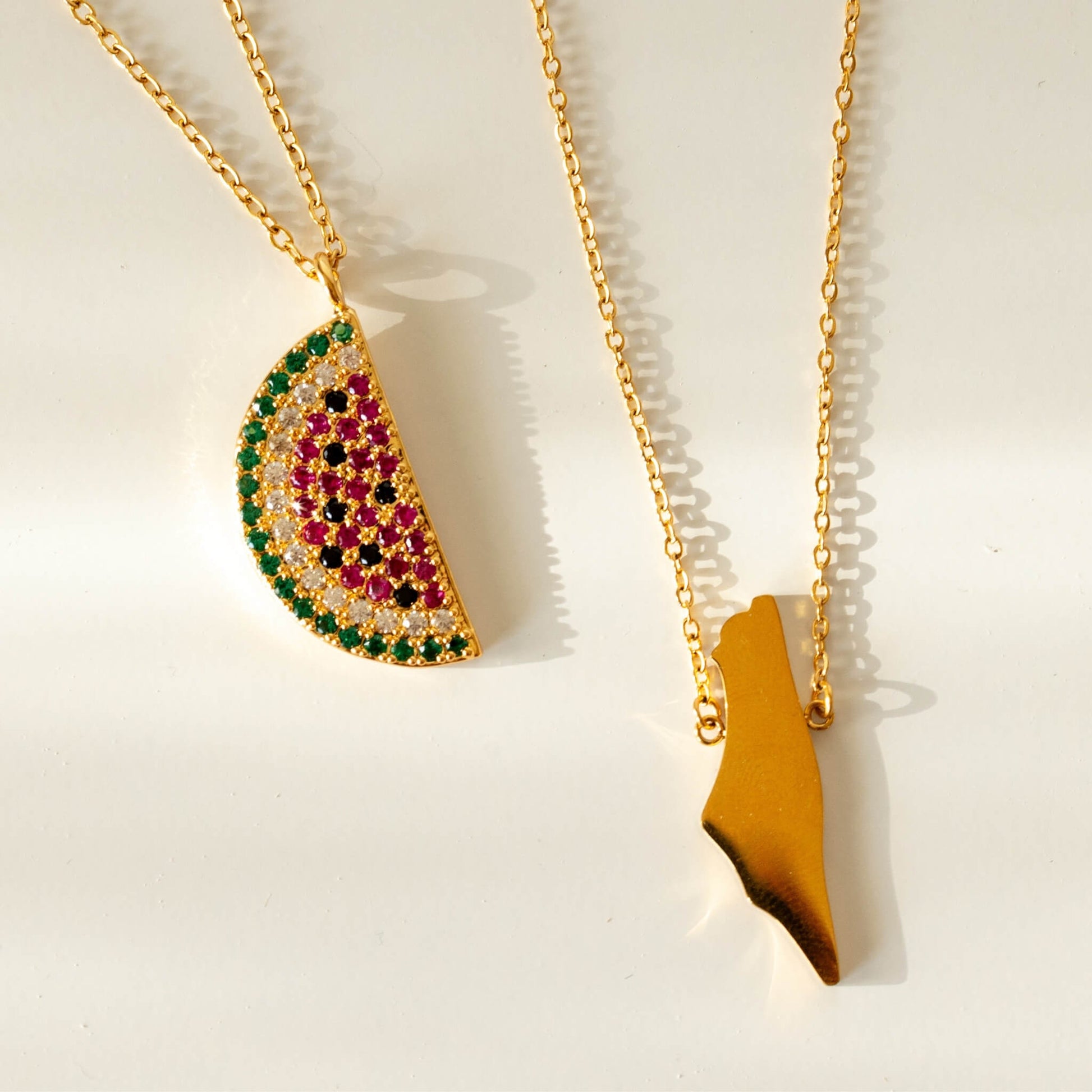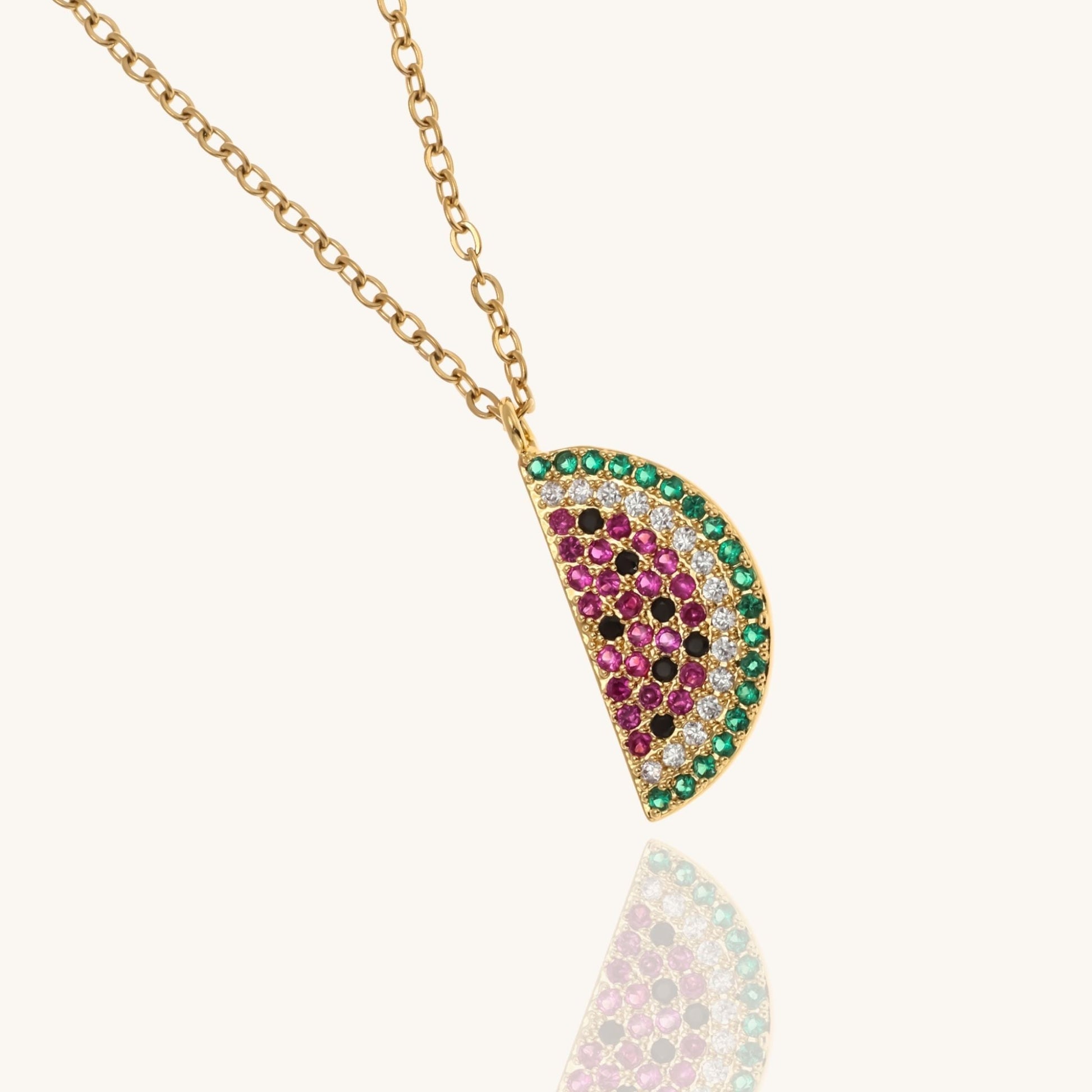 The Watermelon Necklace is a vibrant and meaningful piece, symbolizing the spirit and resilience of Palestine. The pendant, designed to resemble a watermelon, features bold, vibrant colors and intricate details, representing both the beauty and cultural significance of this beloved fruit in Palestinian heritage.